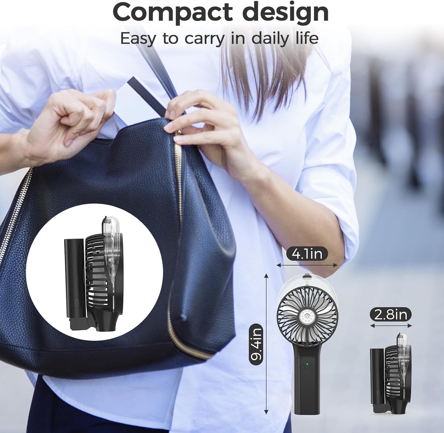- 【Enhanced Cooling with Misting】 Equipped with a 25ml visible misting tank and an included 60ml water bottle, this small handheld fan sprays an ultra-fine cool mist into the air and moisturizes your skin, cooling you down faster whether you're at home or outdoors