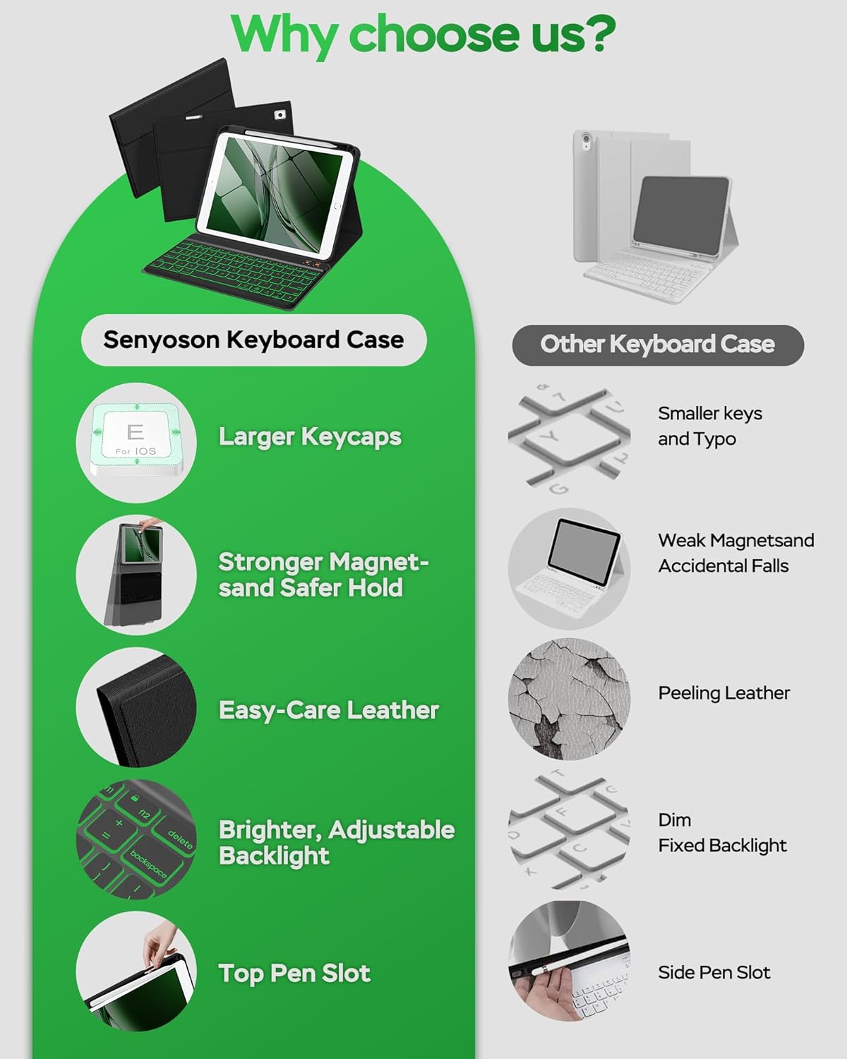 - 【Premium Material】Senyoson for ipad keyboard case is made of good quality PU. Soft, smooth and it gives a luxurious feeling. The interior case is made of high-quality flexible TPU with honeycomb heat dissipation. Keyboard case can protect your tablet from drops and scratches. Precise cutout allows full access to all ports, sensors, speaker, microphone and camera