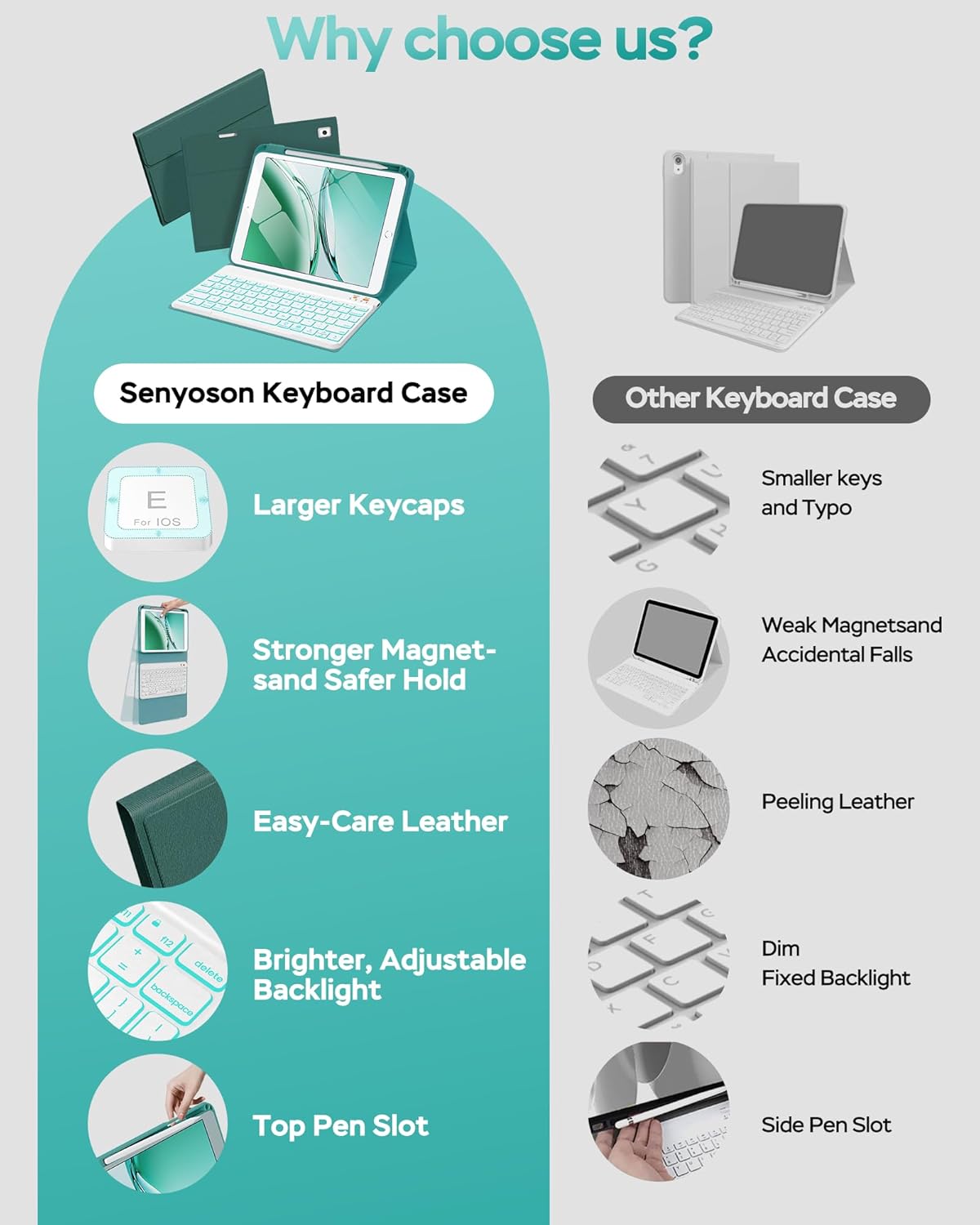 - 【Premium Material】Senyoson for ipad keyboard case is made of good quality PU. Soft, smooth and it gives a luxurious feeling. The interior case is made of high-quality flexible TPU with honeycomb heat dissipation. Keyboard case can protect your tablet from drops and scratches. Precise cutout allows full access to all ports, sensors, speaker, microphone and camera