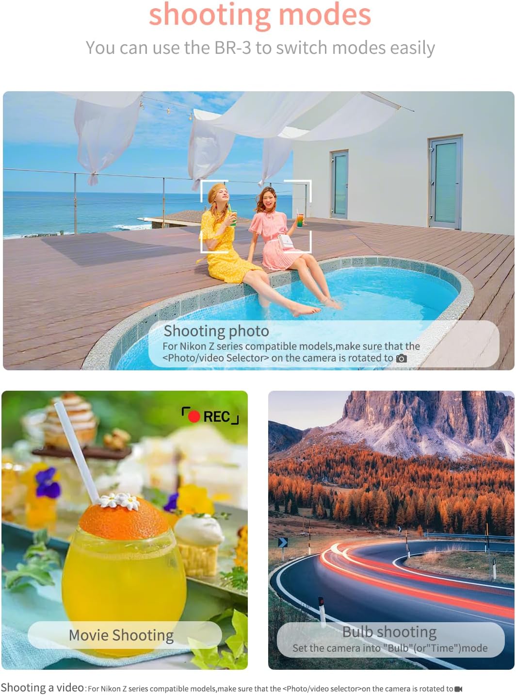 - Multifunction:This wireless shutter release for nikon supports immediate Release,shooting videos,zoom the camera,Multi selector on remote allows you to adjust camera setting remotely