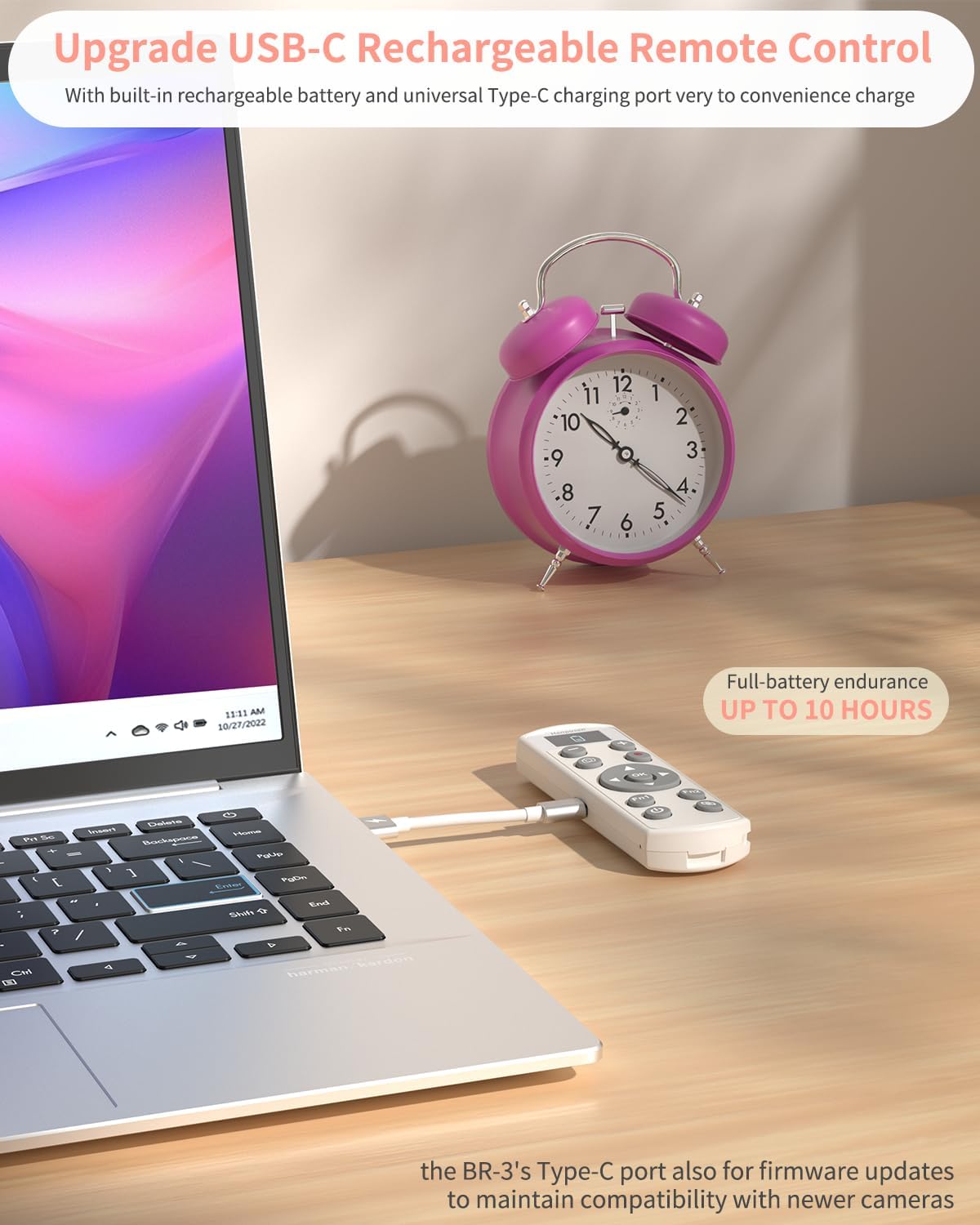 - USB-C Rechargeable Remote for Nikon Cameras This wireless camera remote for Nikon comes with a built-in rechargeable battery and a versatile USB-C charging port, making it easy to power up using TYPE-C,Once fully charged, it delivers up to 10 hours of uninterrupted operation, ensuring consistent performance for your photography needs. The USB-C port also enables firmware updates, keeping the remote compatible with the latest camera models for long-term usability.