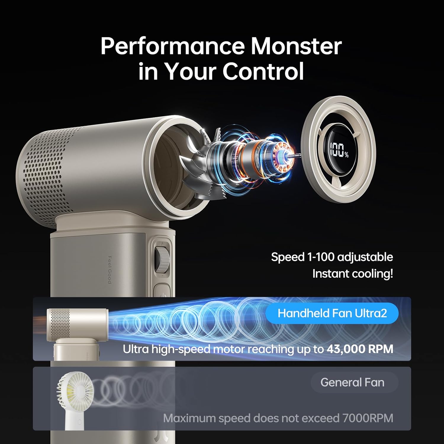 - 100 Speed Hurricane: Portable fan has powerful 1-100 adjustable wind speeds, 43000 RPM ultra motor, max wind speed reach 17 m/s. Press and hold for 3s into 100 speed, activate Storm Mode! Release to restore the original speed. Easy to operate, adjusted by a scroll wheel, this personal fan can be customized for cooling tailored to your needs.