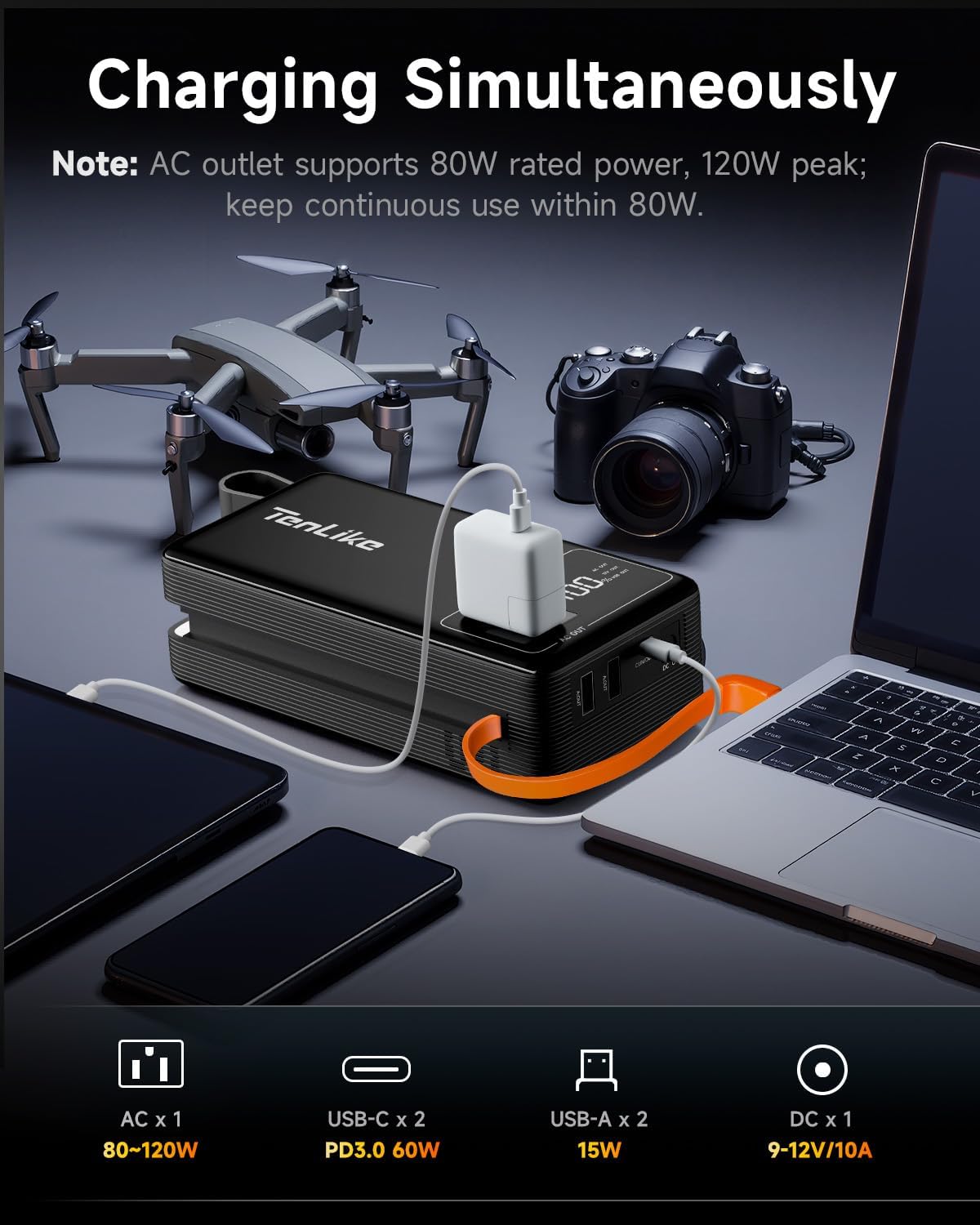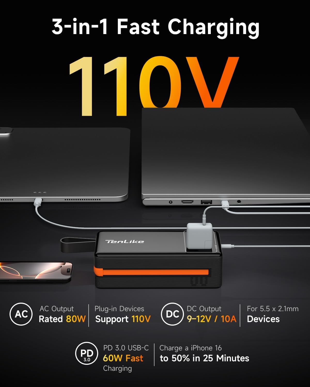 - 【Built-In 60W PD Fast Charging Cable】Our Tenlike power station features a built-in 60W PD fast charging cable, providing efficient charging for your devices. Quickly recharge your smartphone, tablet, or laptop, helping you stay powered up and connected when you need it most