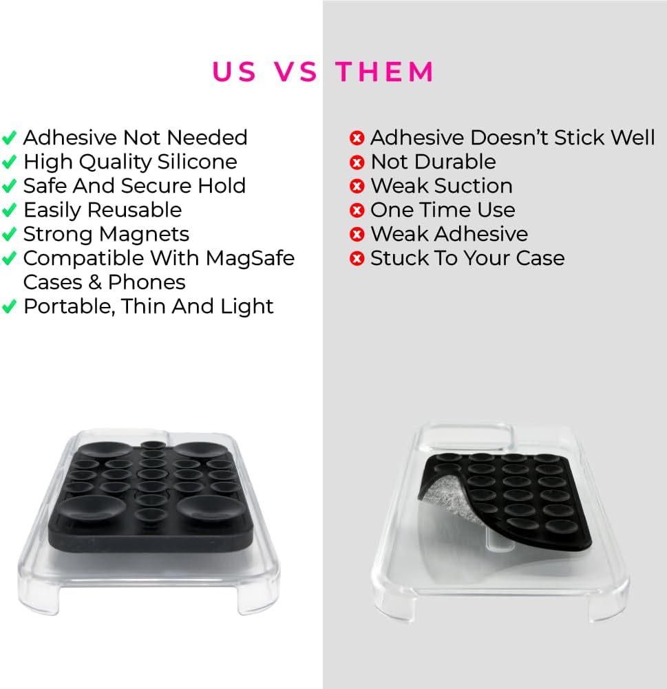 - DURABLE & VERSATILE DESIGN: This magnetic phone suction features durable silicone in both small and large anchor suction cups for a strong hold. The phone sticky grip sticks firmly to mirrors, tiles, metal, & windows, leaving no residue. Lightweight and portable, it’s the ideal on-the-go accessory for easy attachment & detachment.