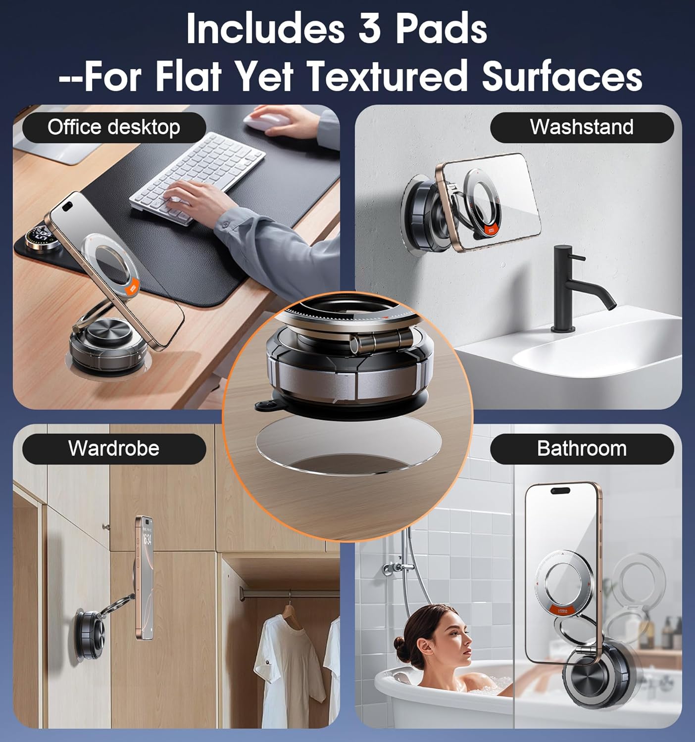 - 【Versatile Mounting – Smooth & Textured Surface Compatibility】 Designed for various surfaces, this suction phone mount includes a sticky plate for textured dashboards. It securely attaches to windshields, glass doors, ceramic tiles, acrylic, polished metal, stainless steel, aluminum, chrome, glossy painted walls, and more. Whether at home, in the office, or in the car, this vacuum magnetic phone stand is the perfect hands-free solution.