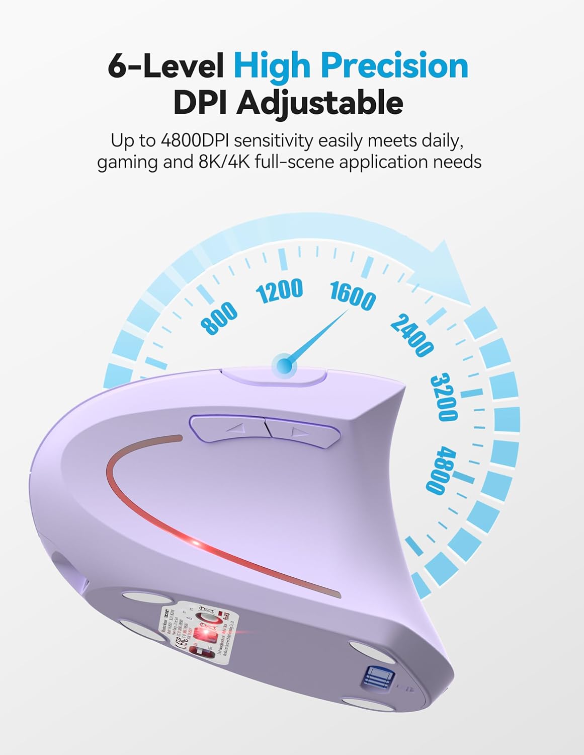 TECKNET Ergonomic Mouse, Rechargeable 2.4G+Bluetooth Vertical Mice 6 DPI Adjustable, Wireless Optical Carpal Tunnel Mouse for Right Hand, Silent 6 Buttons for Laptop, PC, MacBook, iPad - Light Purple