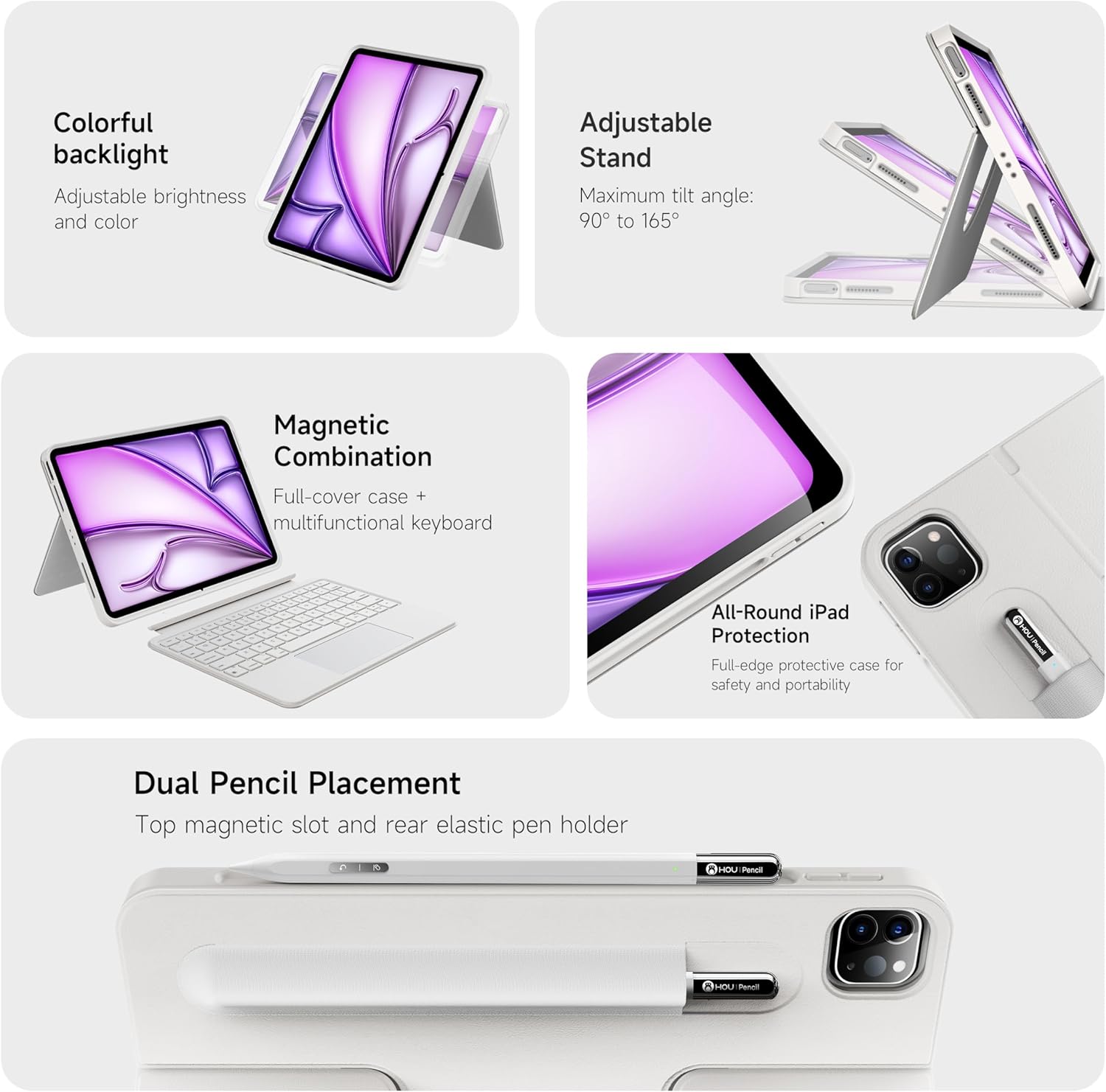 HOU iPad Air 11 Case with Keyboard (M3 2025, M2 2024) Detachable Rotatable Magnetic Full Protection Case, 7-Color Backlight, Touchpad, Elastic Pen Holder for iPad Pro 11 (4th-1st) & Air (5/4th)–White