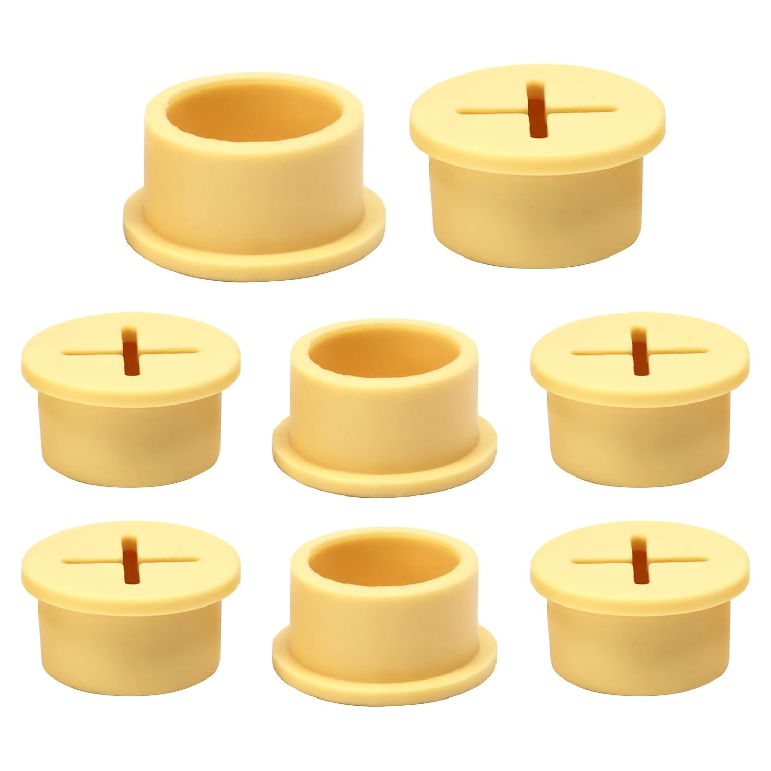 - Dimension and Quantity: 8 yellow desk grommets, + shape desk cord hole cover 3/4 inch (20 mm) diameter, 15/16 inch (24 mm) overall diameter, 1/2 inch (12 mm) height, 9/16 inch (15 mm) through-hole diameter, 5/64 inch (2 mm) thicker
