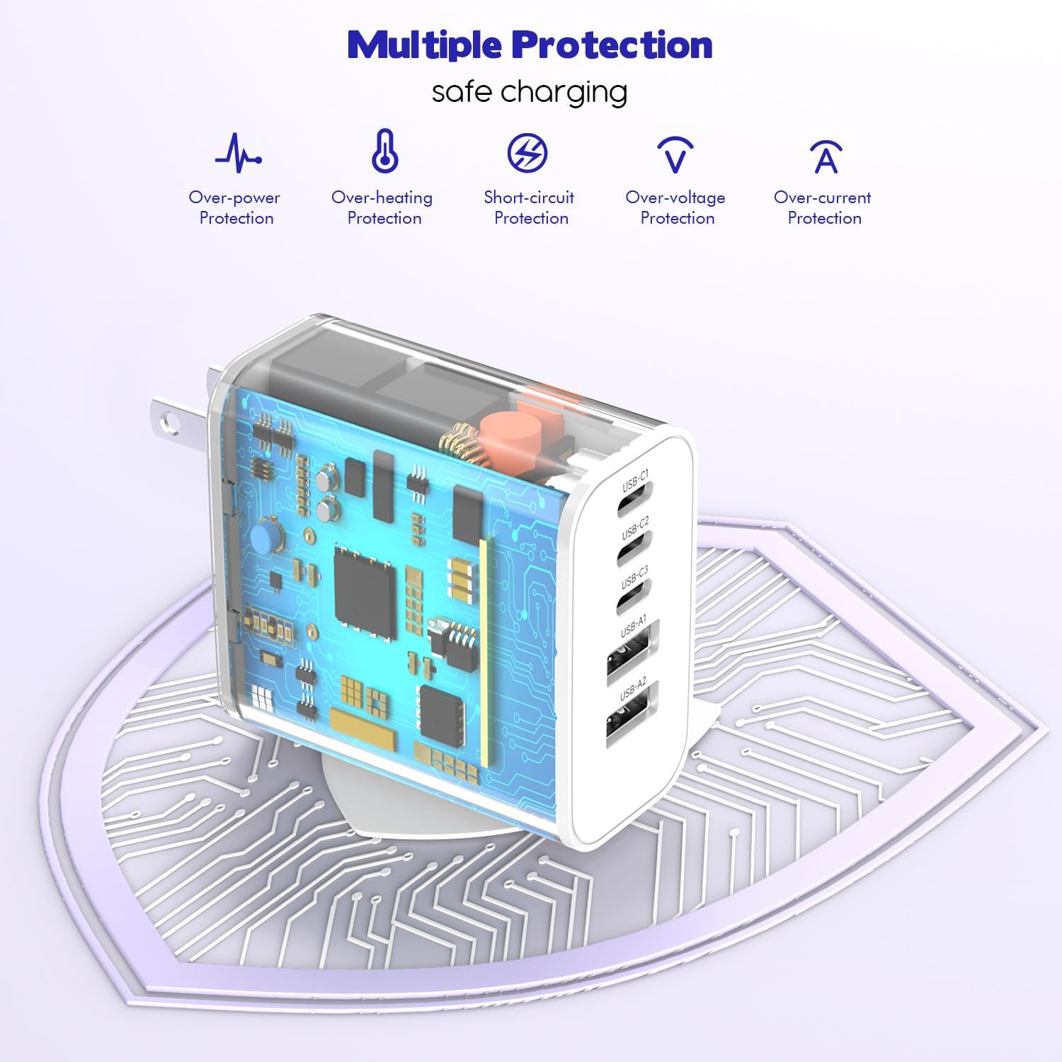 - 【60W Multiport iPhone Charger Block】60W USB C Fast Charging Blocks support the Power Delivery and Quick Charge 3.0 fast charging functions with a total power of up to 60W.3*USB C Port+2*USB A Port charging 5 devices simultaneously. Using a USB port alone can achieve optimal charging performance for your iPhone.
