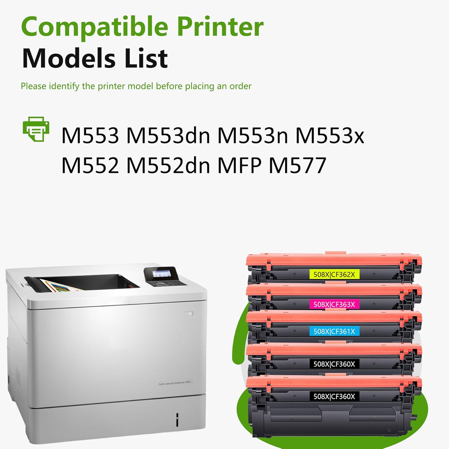 508X Toner Cartridge Combo Pack (5-Pack, 2Black/1Cyan/1Magenta/1Yellow) Replacement for HP 508X 508A 508 Toner CF360X CF361X CF362X CF363X Compatible for M553 M552 553 MFP M577 Series Printer