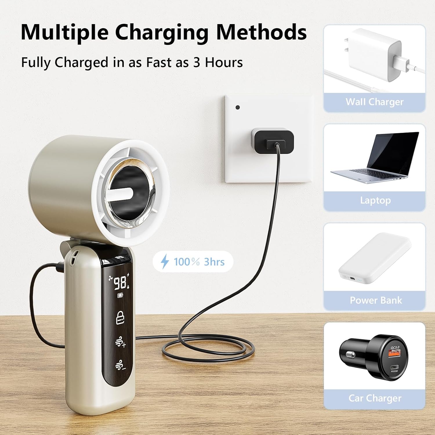 - ⚡[Multiple Charging Methods - Fast Charging] This USB rechargeable fan supports a 5V-2A fast charging plug and can be fully charged in just 2.5-3 hours, providing up to 10 hours of cool time when fully charged. The package of this battery-powered fan also includes the USB connection cable (1.8 feet), which allows you to charge it using a regular USB socket, a laptop, a mobile power supply, or a car charger.