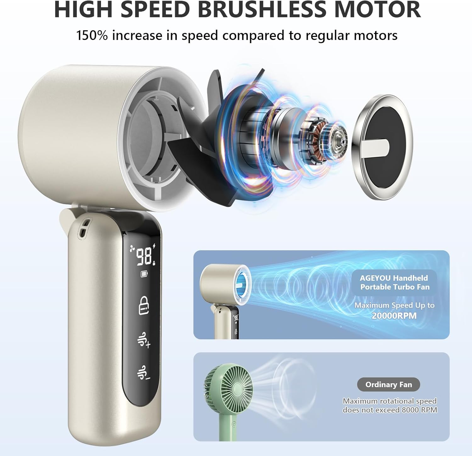 - 🌀[Brushless Motor - Super Power] The combination of 3-phase brushless motor and 4000mAh battery greatly increases wind speed, power and range. Maximum wind speed is up to 10m/s. The maximum speed of the handheld fan is three times higher than a normal personal fan, up to 20000 rpm. A single charge lasts for 3-15 hours of continuous cooling.