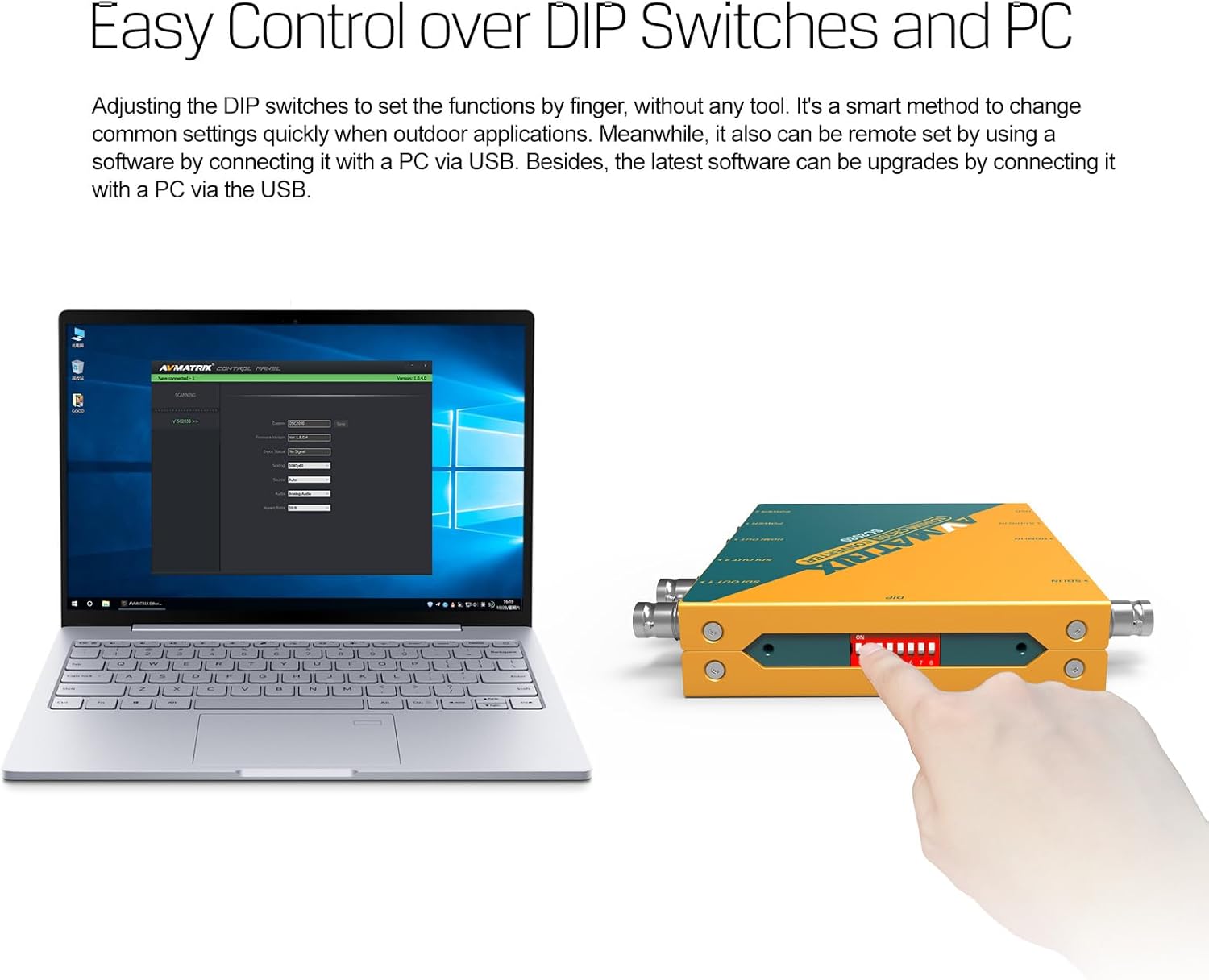 - 【User-Friendly Control via DlP Switches & USB】This video converter equipped with DlP switches to quick parameter adjustments-ideal for on-site urgent setup needs, Additionally, it features USB connectivity, which supports two key functions: PC-based remote control and firmware updates. This user-friendly design makes it suitable for both outdoor mobile setups and fixed studio environments.