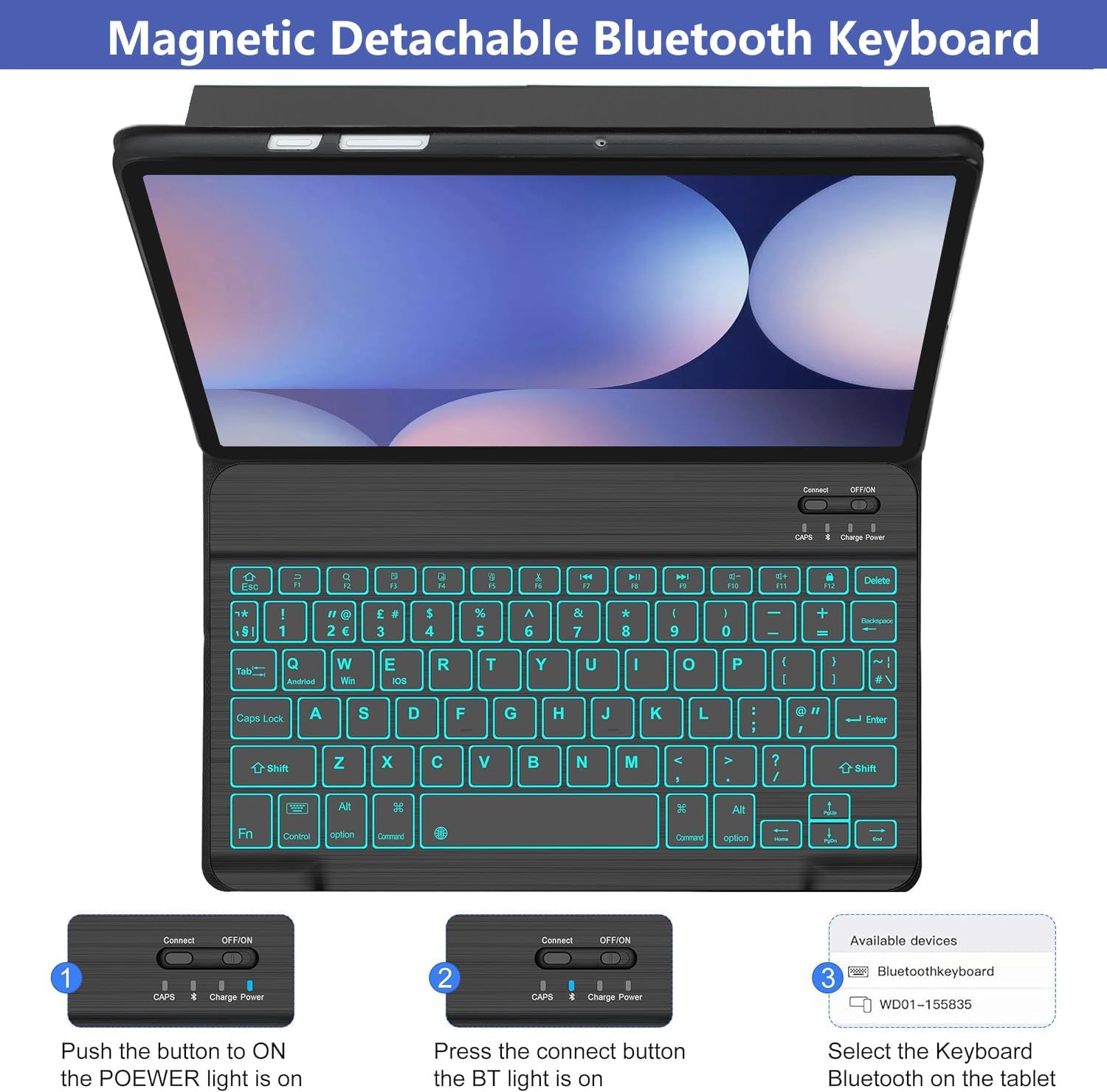 - ➤【7 Color Backlit Keyboard for Tab S9 FE+】Enjoy customizable typing experiences with the stunning 7 color backlit Bluetooth keyboard, which not only enhances visibility in low light but also adds a touch of style to your tablet setup. Whether you're using it for work, creative projects, or personal use, this keyboard enhances both functionality and aesthetics, making it a valuable accessory for tablet users who seek both performance and style.