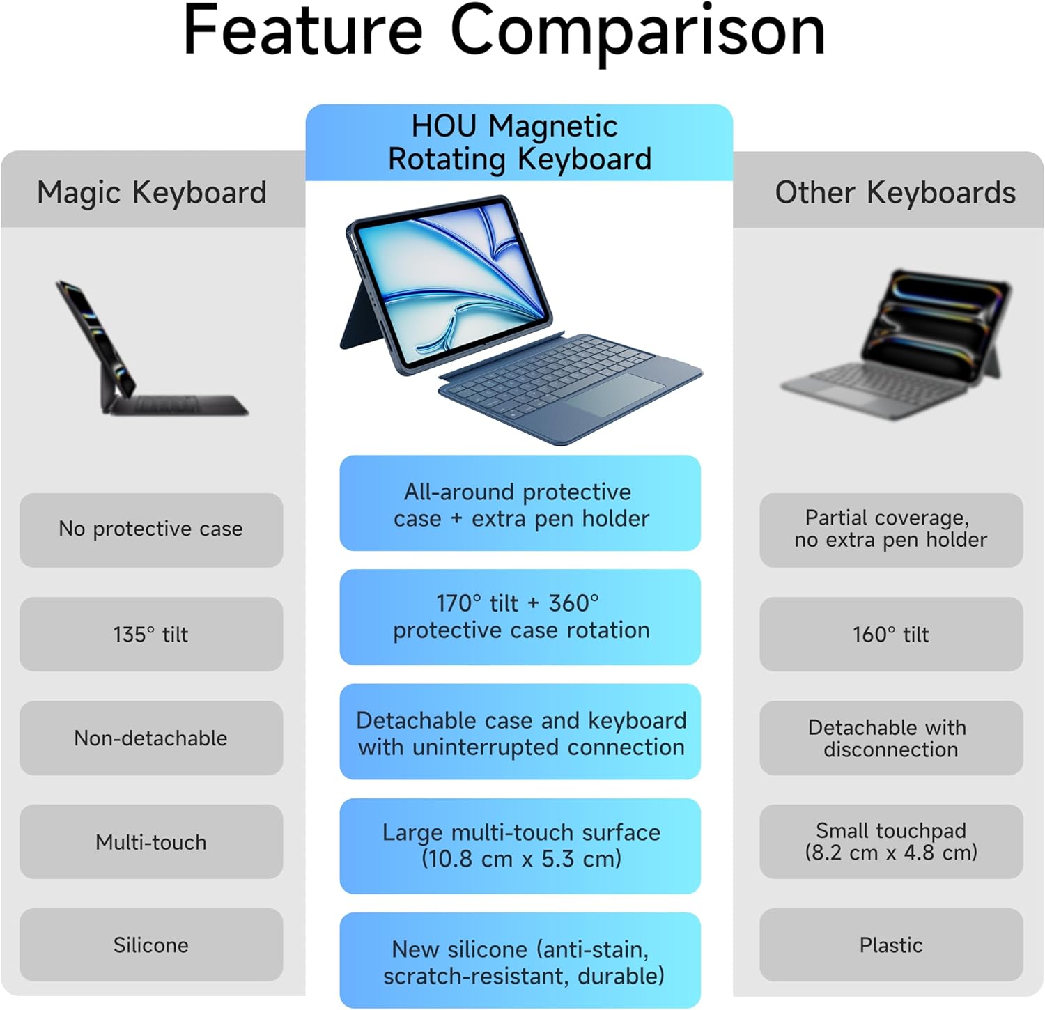 - 🛡[Comprehensive iPad Protection]: Designed for durability, the HOU iPad Air 11/Pro 11 keyboard case is crafted from high-strength silicone, providing 360° all-around protection. Equipped with a magnetic slot and elastic pen holder, compatible with Apple Pencil (USB-C version) and compatible third-party styluses (magnetic charging not supported)