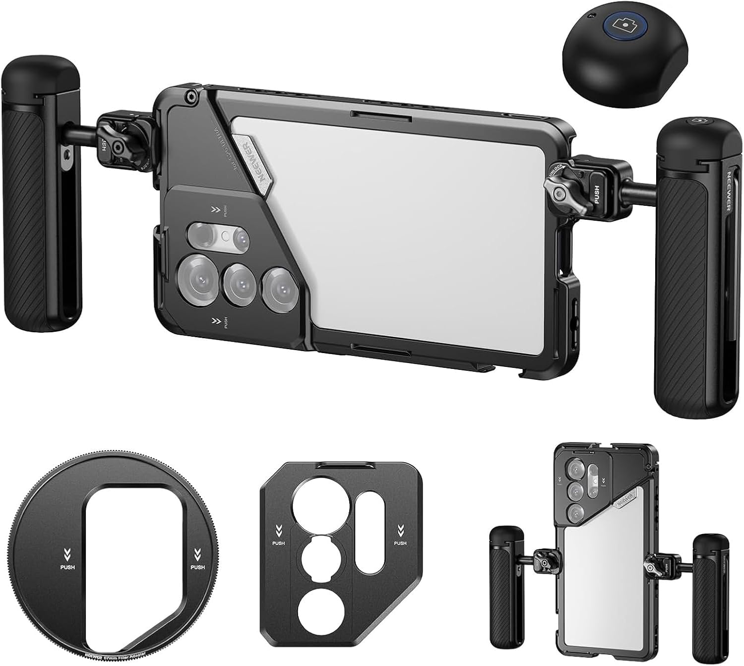 NEEWER PA082 S25 Ultra Phone Cage Holder for Recording Filming with 2X Handle, 67mm Filter Adapter, 17mm Lens Backplate, T Mount Adapter, Video Rig Stabilizer Compatible with Samsung Galaxy S25 Ultra