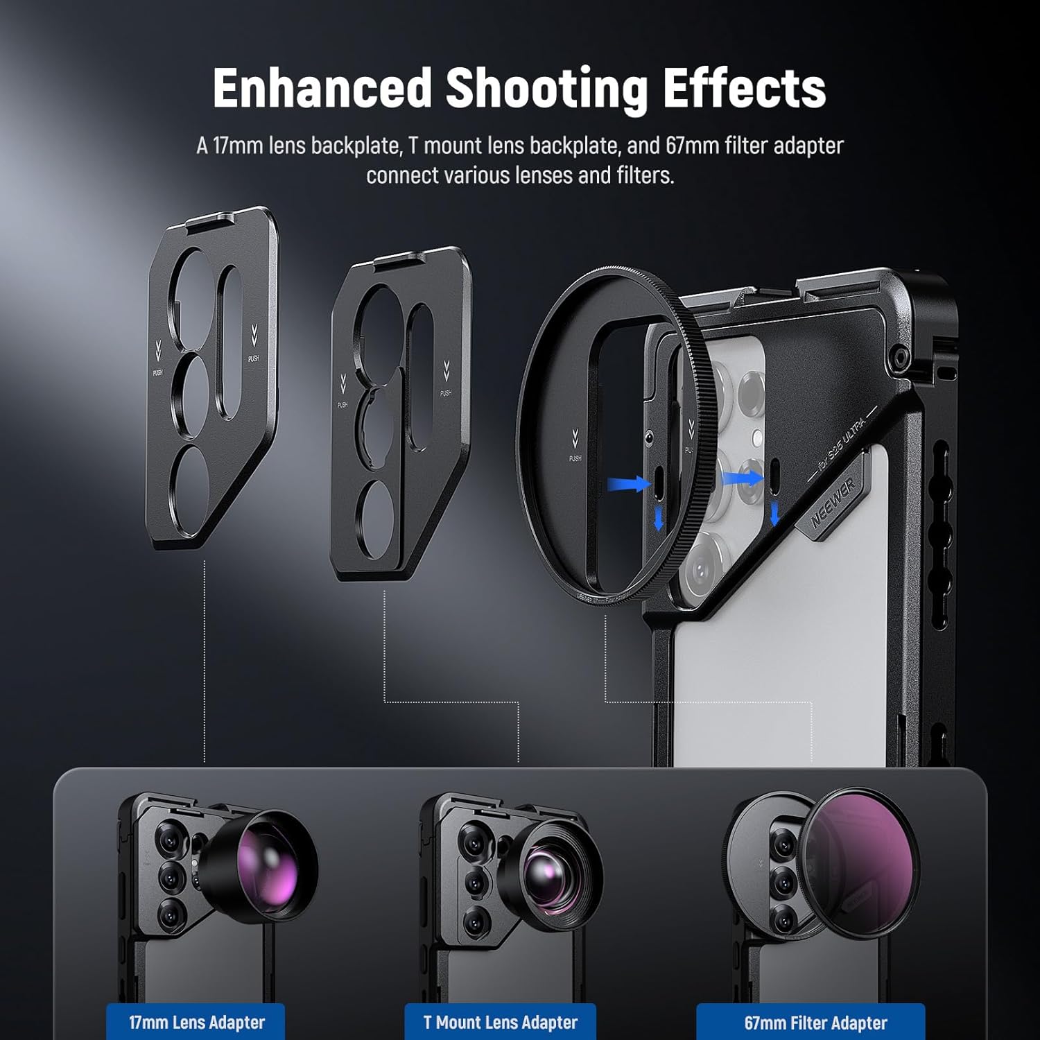 - 【17mm & T Mount Lens Backplates】 The 17mm threaded lens backplate mounts 105mm macro, 10x macro, 8mm fisheye, 45x microscope with LED light, 7x telephoto, 60mm telephoto, 18mm wide angle, 1.55x blue anamorphic, and other 17mm NEEWER phone lenses. The T mount lens backplate is compatible with Moment T Series mobile lenses, including anamorphic, macro 10x, tele 58mm, wide 18mm, and fisheye 14mm (all lenses sold separately)