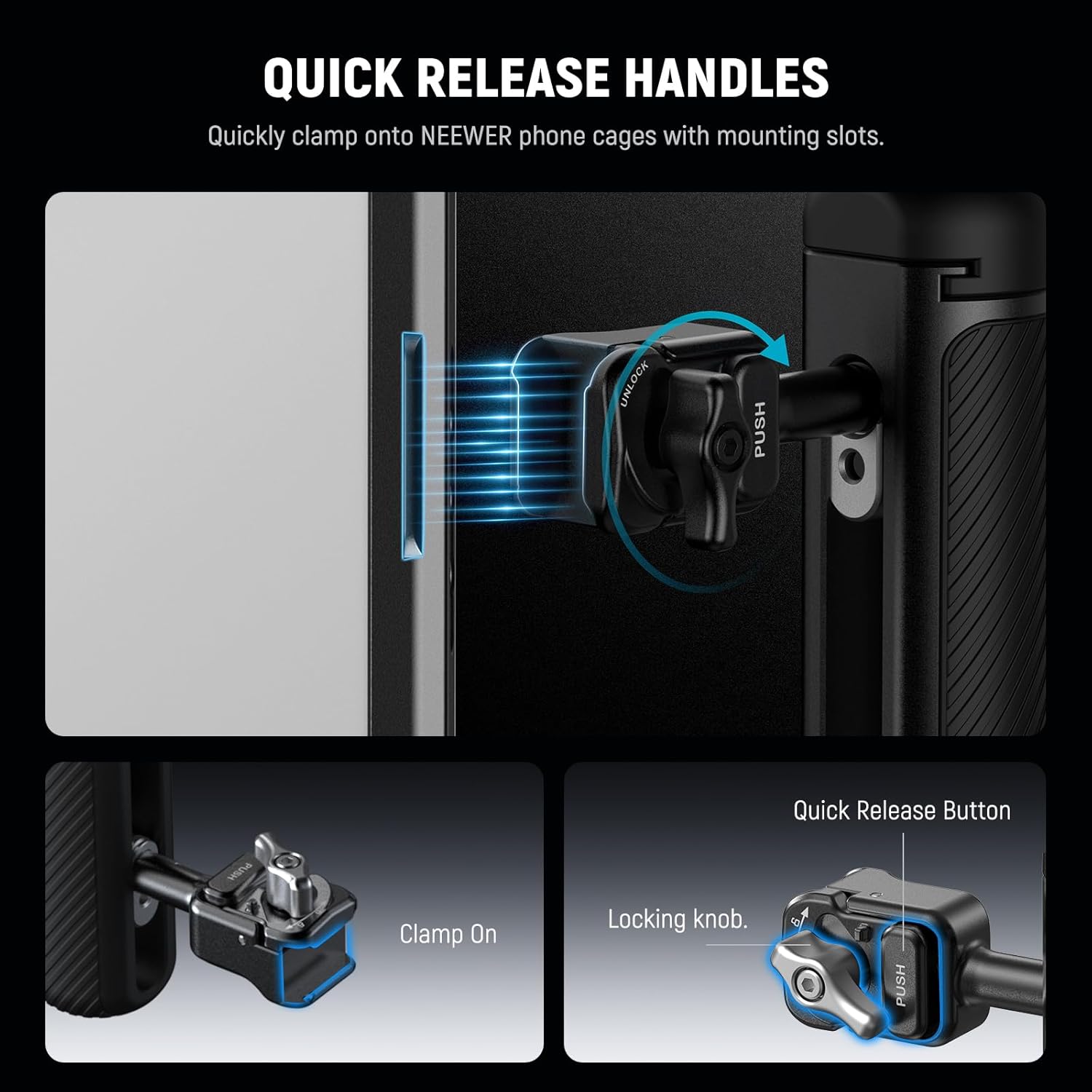 - 【1 Click Installation with Full Access】 This integrated phone cage holder for video recording and filming quickly opens and locks via a side button, offering full access to the camera, charging port, and buttons. Internal shock absorbing rubber cushions make this photography gear a protective and versatile phone stabilizer equipment for professional and stable handheld shooting