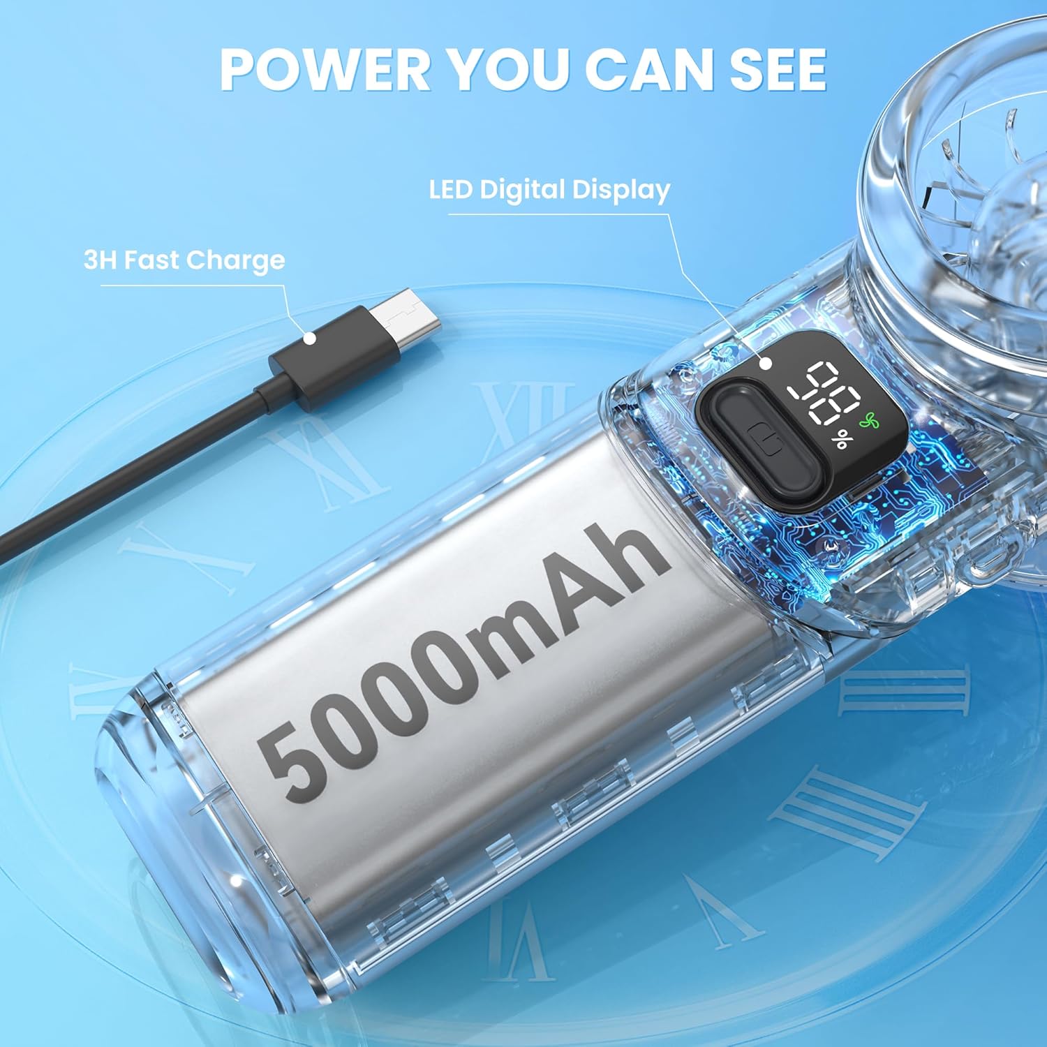 - 5000mAh Personal Fan: This battery powered fan lasts 4-19 hours—enough for a cross-country flight or weekend camping trip. USB-C fully recharges in 3hrs at your hotel/campsite - faster than most portable fans