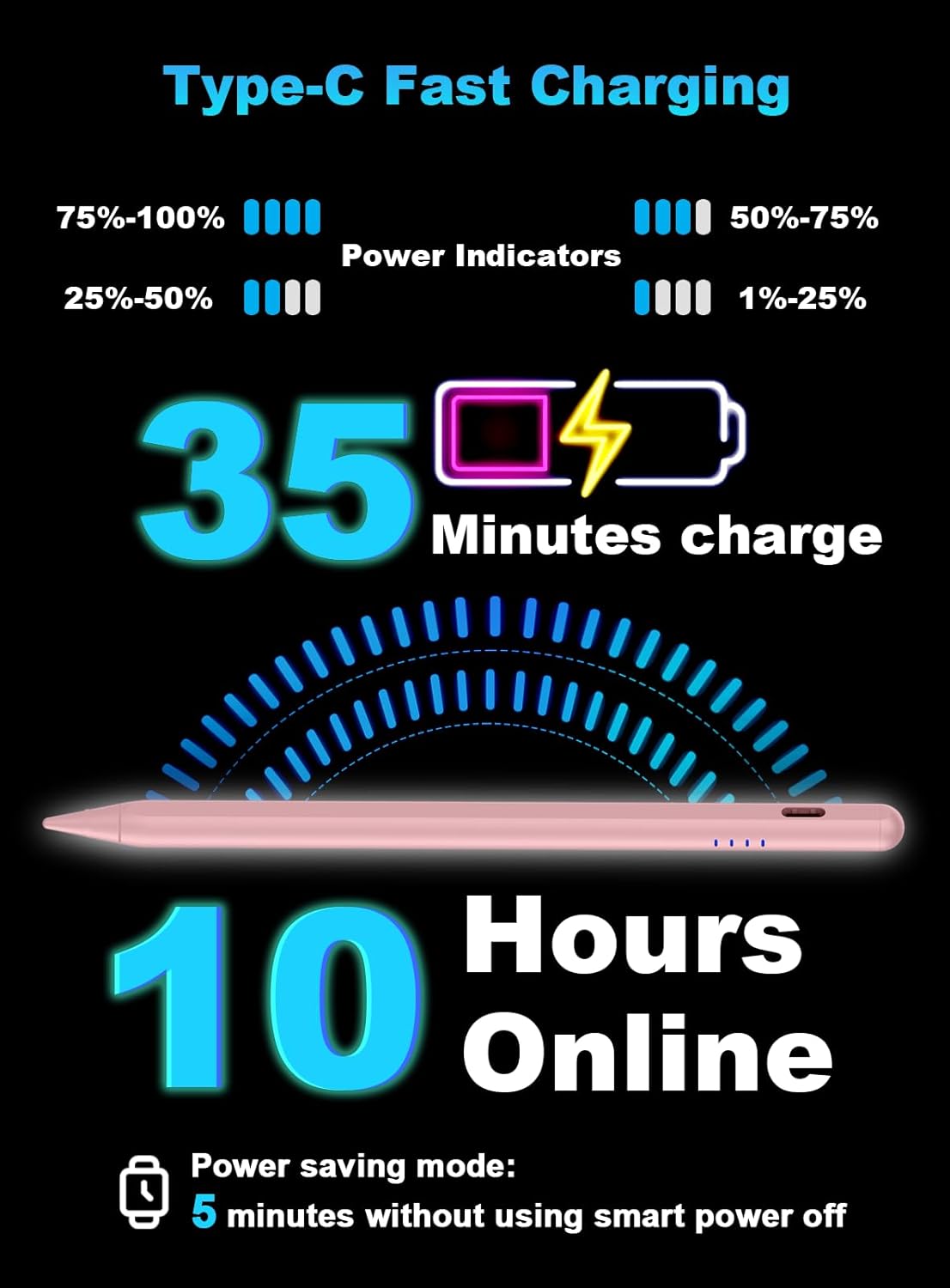 - 【Easy to Use & LED Power Display】 : Quickly tap the top button twice to turn it on/off. The touch screen pen can be used immediately and no Bluetooth connection is required. The iphone pen is equipped with a 4-LED indicator light on the side, allowing you to check the power status in real time, which is worry-free. It will automatically shut down after 5 minutes of inactivity, which is highly efficient and energy-saving