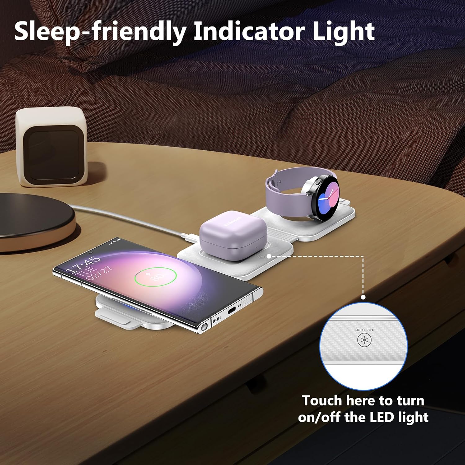 - SLEEP & USER-FRIENDLY CHARGER: Design with a turn ON/OFF function. Easy to turn off the LED light with the touch button (next to the earbuds charging area). 3 In 1 design solving the problem of messy charger cables on your desk. The foldable and adjustable design makes your business trip and vacation convenient and happier.