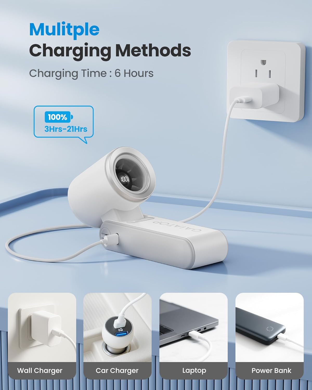 - 4000mAh and 21 Hours Long Battery Life : The portable fan has 4000mAh large-capacity battery which lasts 3-21 hours continuously,help you get difficult times. Hand fan compatible with TYPE-C ports, laptops, power banks and car chargers.