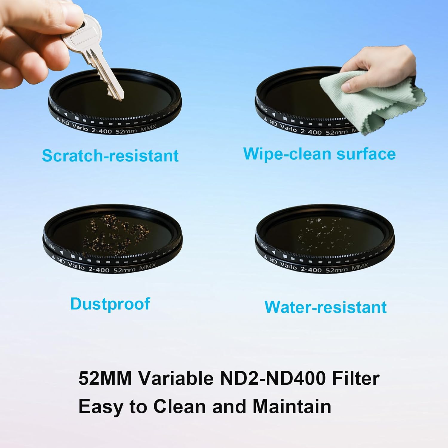 - 52mm Adjustable ND Filter (ND2-ND400)Features 9 adjustable stops to meet diverse shooting needs in varying lighting conditions.Note: The black "X" cross visible in photos is an optical phenomenon caused by using overly dense ND settings under specific lighting. To minimize this effect, avoid rotating the filter to its densest position.