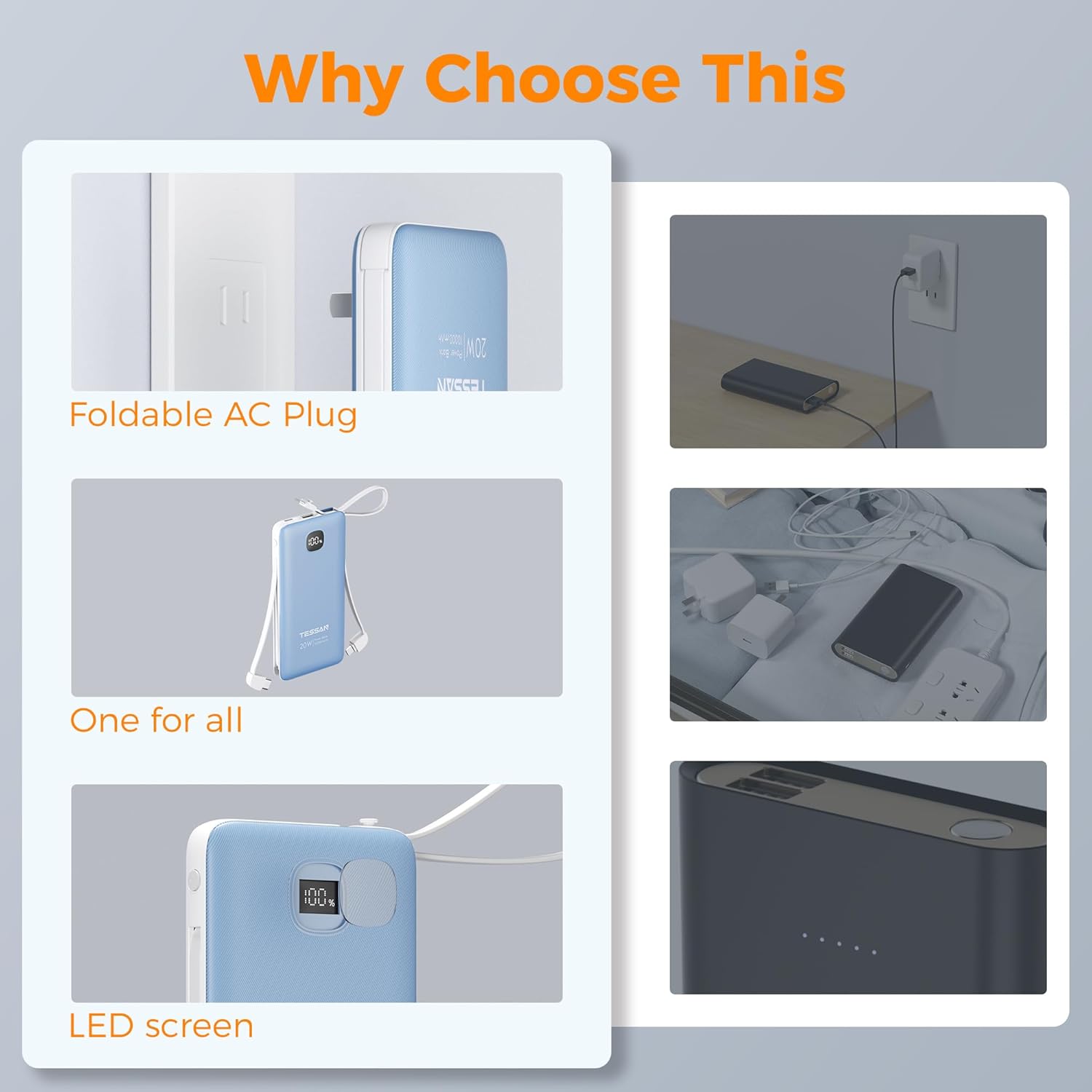 - Portable Phone Charger Built in Cable & Wall Plug: Conveniently charge your devices and the power bank for iphone itself with built-in cables and USB-C port. The integrated AC wall plug eliminates the need to carry additional adapters and cables,TESSAN battery pack simplifying your charging routine.