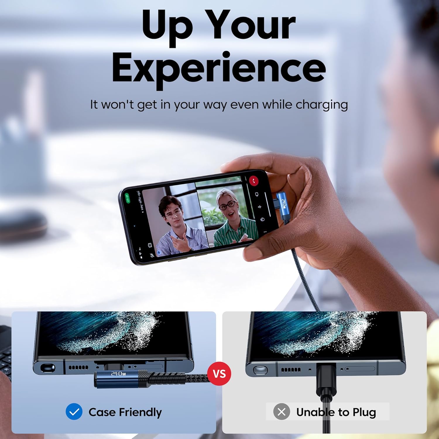 - Universal Compatibility for All USB-C Devices: Designed for seamless integration, our cable supports a wide range of devices requiring 60W–240W power, including iPhone (16 Pro/Max), Samsung Galaxy S20–S24, MacBooks (Pro/Air), iPads (Air/Pro), and more. Its versatile 90° right-angle design ensures effortless connectivity without tangling, while maintaining optimal charge efficiency. Perfect for gaming, video streaming, or daily use—this cable adapts to every need