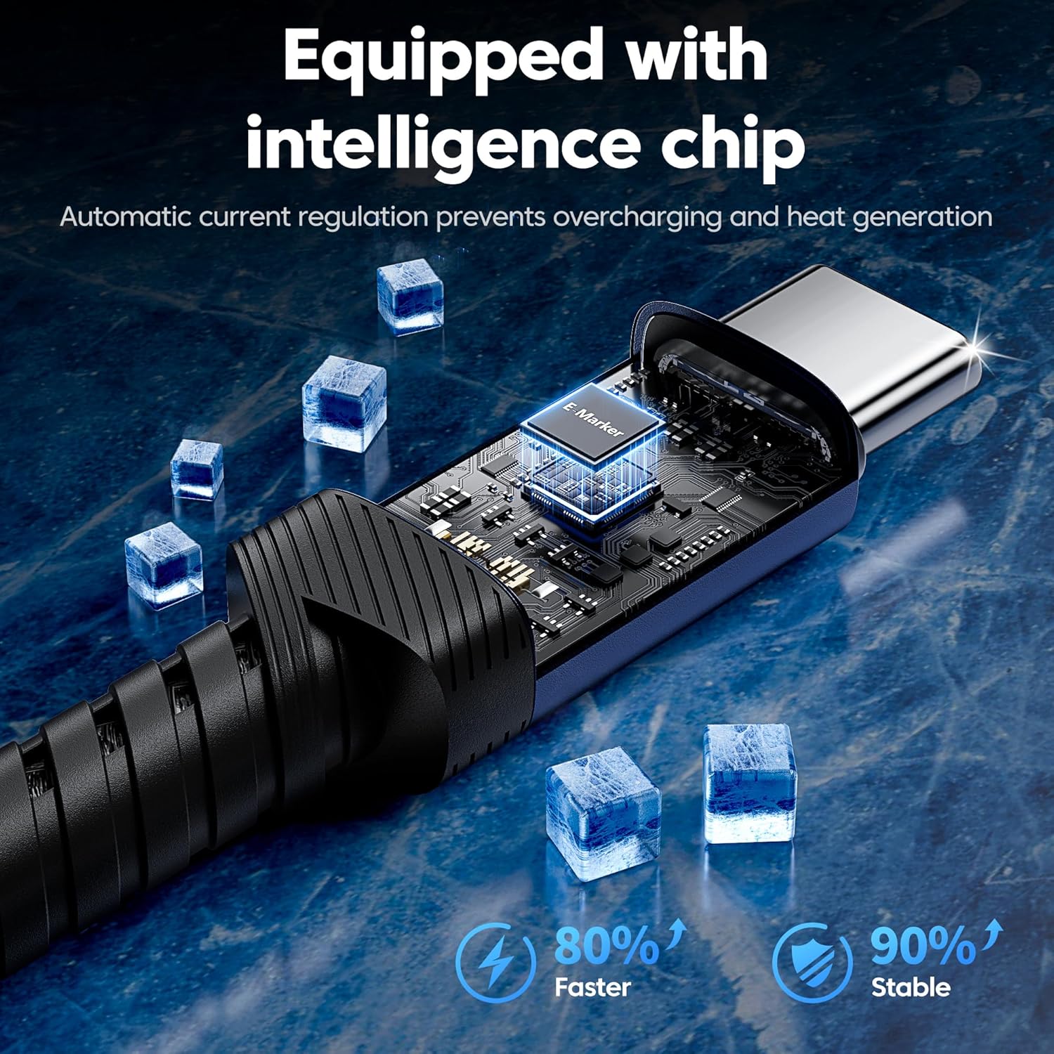 - Advanced E-Mark Safety & Smart Protection: Built with an upgraded E-Mark 2.0 chip, this cable guarantees device safety through intelligent temperature control and automatic shutdown upon full charge. It prevents overcharging, extends battery life, and safeguards against voltage fluctuations. The reinforced SR joint and laser-welded construction further ensure durability, making it one of the toughest cables available