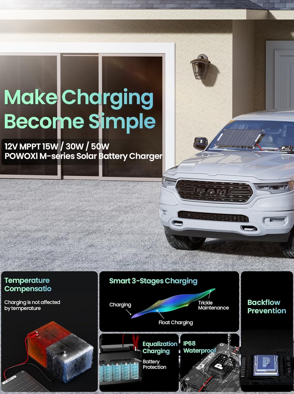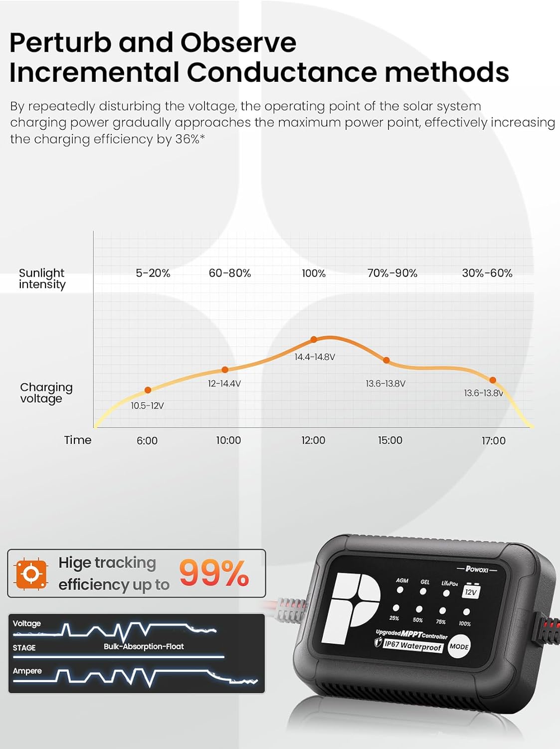 - Enhanced Independent MPPT Controller: POWOXI's innovative IP67 potted technology ensures your solar trickle charger can handle any wet environment. It intelligently adapts to your battery's temperature across different seasons, delivering the precise charging voltage needed. With a three-stage charging process (Bulk, Absorption, Float), it recognizes and applies the perfect voltage for every battery phase, providing more effective 12V battery charging, superior safety, extended battery life, and enhanced charging performance
