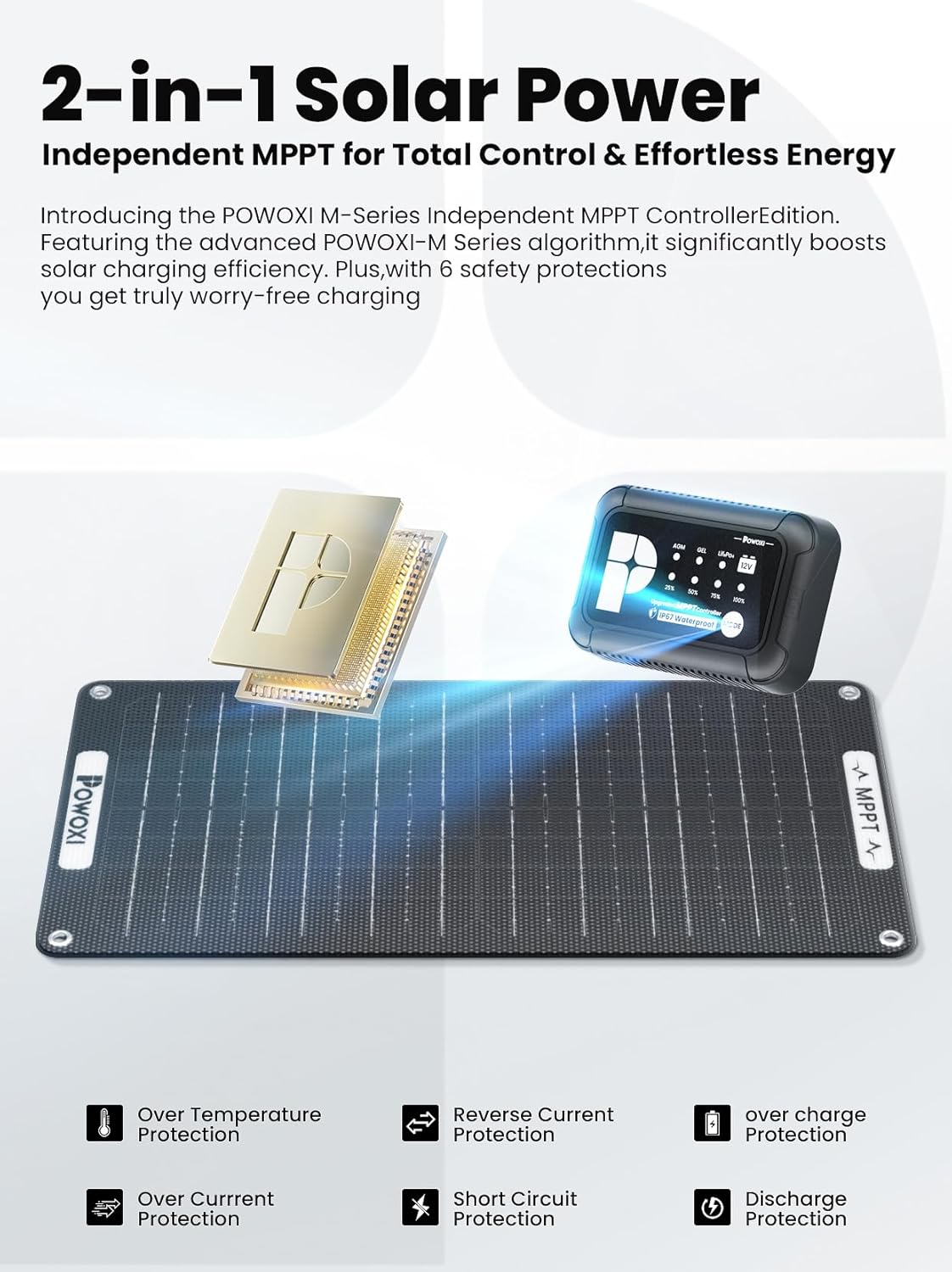 - Get Ready for a New of Solar Charging: Enjoy smarter, high-power charging with the POWOXI M-Series High-Power ETFE Thin & Flexible Solar Battery Charger, featuring a fully potted and sealed IP67 waterproof independent MPPT charge controller built right in—no more searching for a separate controller, as we now offer this convenient 2-in-1 configuration to make your charging experience simple and effortless
