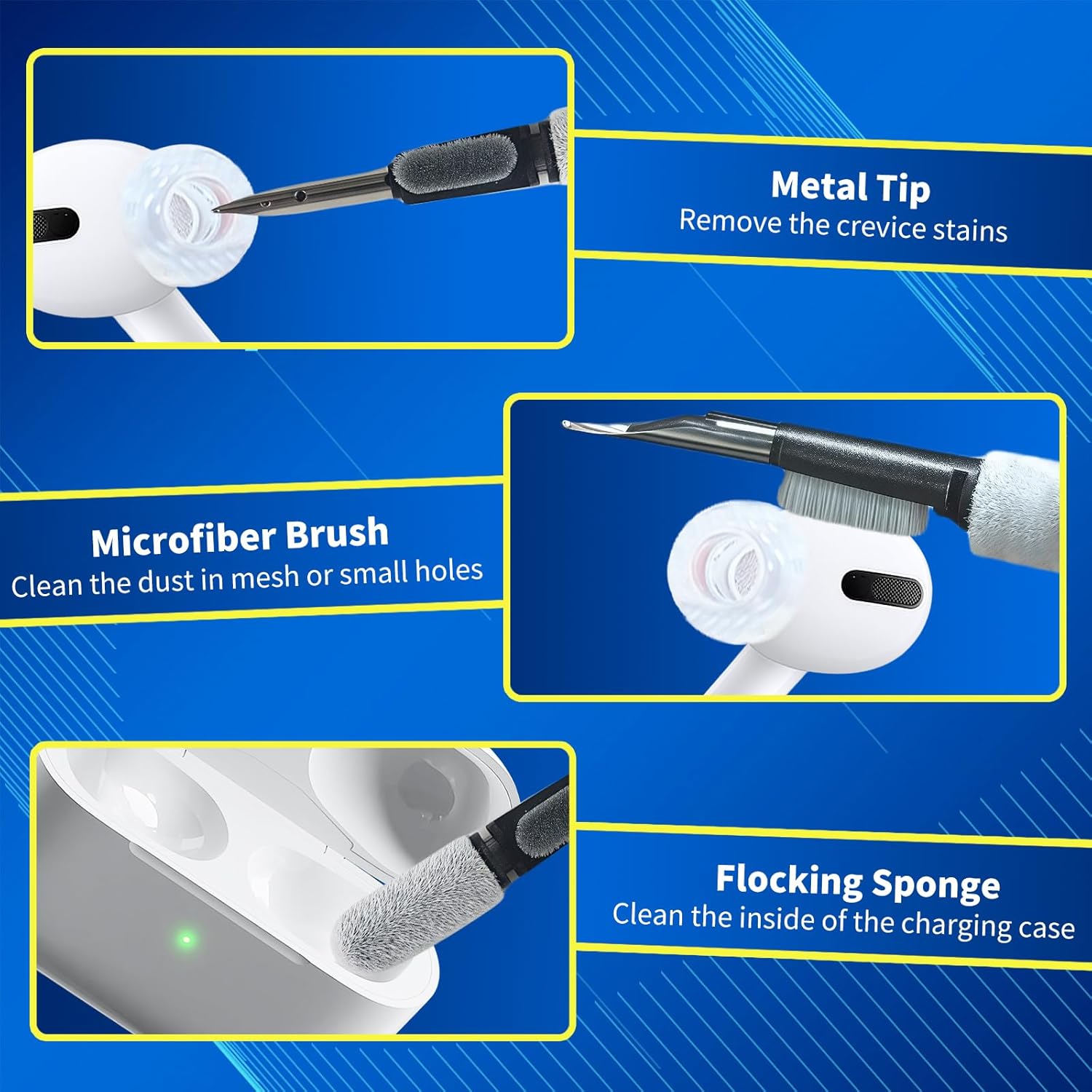 - 【Cleaning Pen-shaped Design】Convenient Double-head hidden design,The tip of the cleaning pen is a metal tip, which can clean the small hole of the earplug, and deeply clean the gap and stubborn dirt. There is a soft microfiber brush under the pen tip,which can easily brush away the tiny part of the headset surface. cleaning pen will meet the cleaning needs of many situations. Suitable for Aiprod pro (2nd/1st)Bluetooth earbuds, headsets, mobile phone, computer, tablet, camera and other digital products