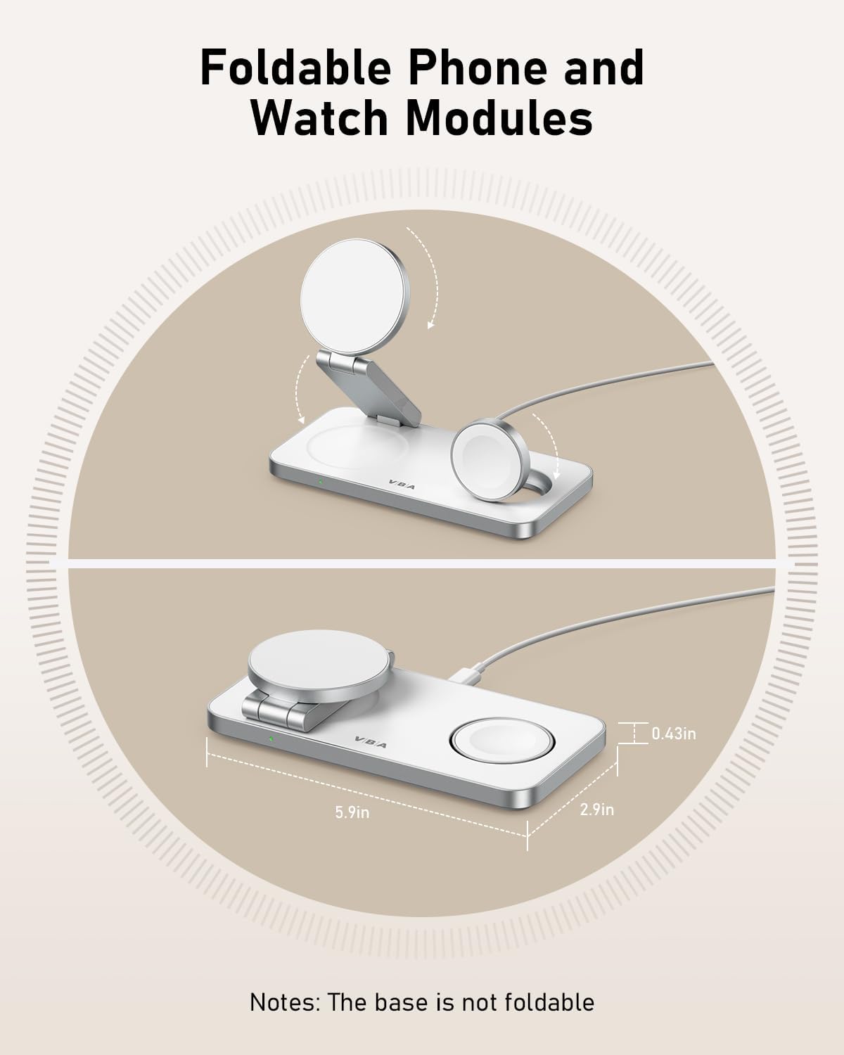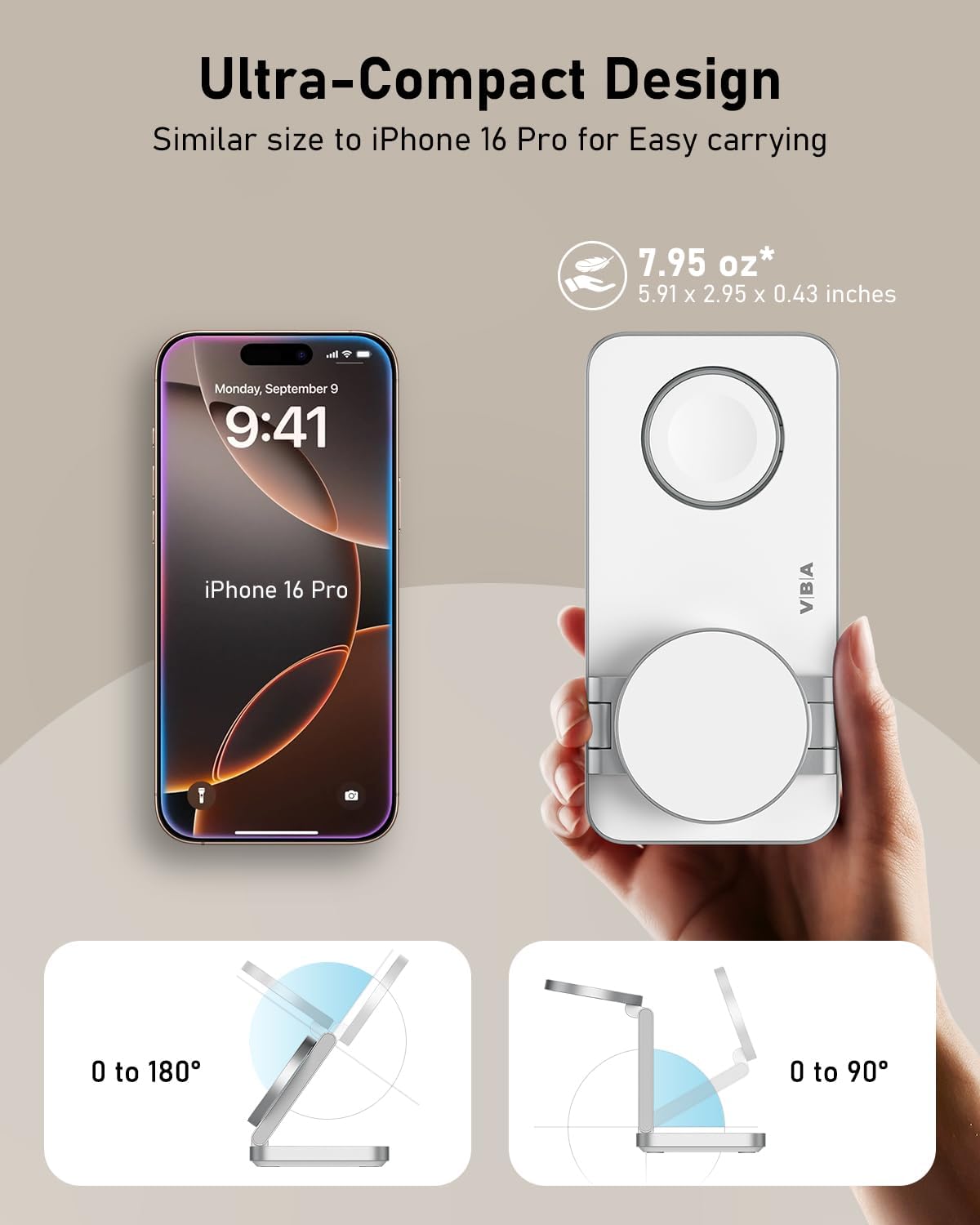 - 【Slim,Foldable & Portable Travel Charger】Engineered for life on the go, our ultra-compact 3-in-1 wireless charger folds down to the size of an iPhone 16, travel-friendly & space-saving,Perfectly for travel, office and bedside use. Phone charger part folds 0-180° for optimal viewing&charging, while the Watch charger rotates 0-89° for Nightstand Mode. Sturdy weighted base makes it stays firmly in place even with your heaviest phone. Premium glossy electroplating,Sleek, scratch-resistant finish elevates any space.