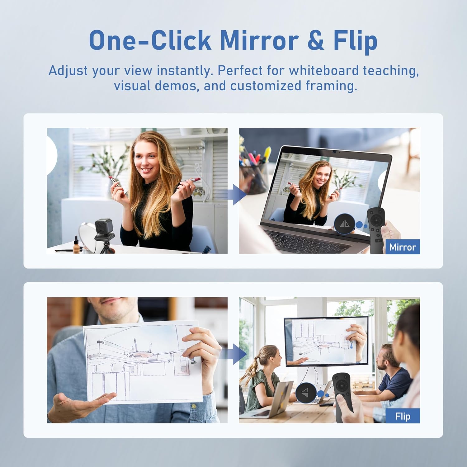 - One-Click Mirror & Flip ---- Need to show text the right way or flip your view fast? Just press a button One-click mirroring and flipping makes your video layout work for any angle, setup, or audience. Simple, smart, seamless. The remote also features one-key to restore the view, freeze frame, mic mute, manual focus, and volume adjustment.