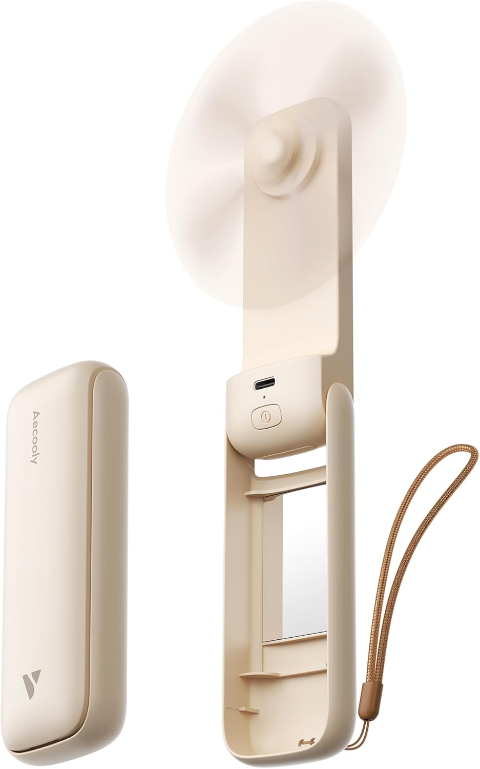 Aecooly Slim Portable Fan with Mirror, Thin Handheld Fan, USB Rechargeable Mini Personal [24H Max Cooling Time], Battery Powered Small Foldable Pocket for Travel, Lash, Makeup, Gifts for Women -Beige