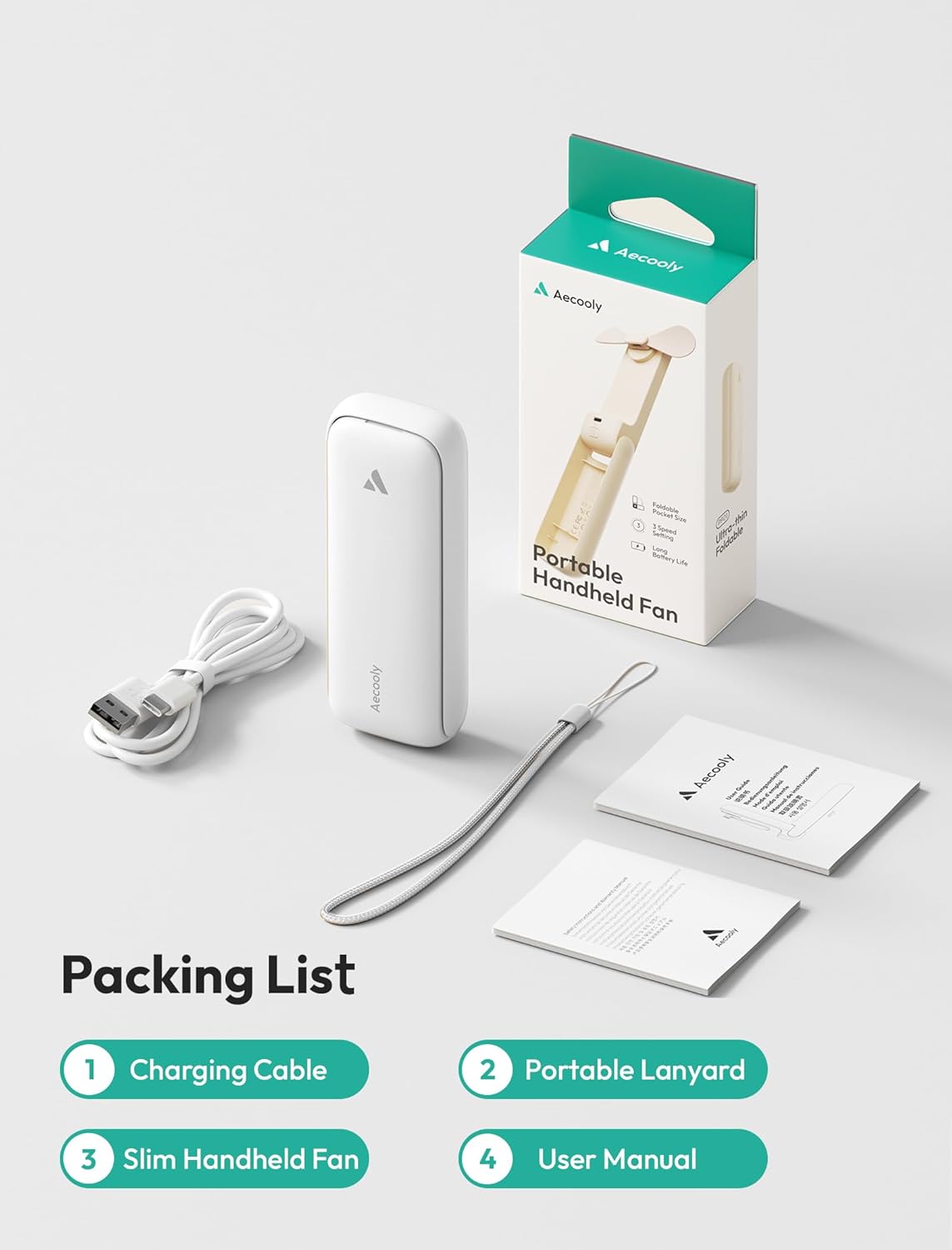 - Slim & Elegant Design: Aecooly Slim Handheld Fan designed for ultimate portability, this fan features a remarkably slim profile and lightweight build. Its sleek and compact form fits effortlessly into your hand, bag, or pocket, combining practicality with modern aesthetics