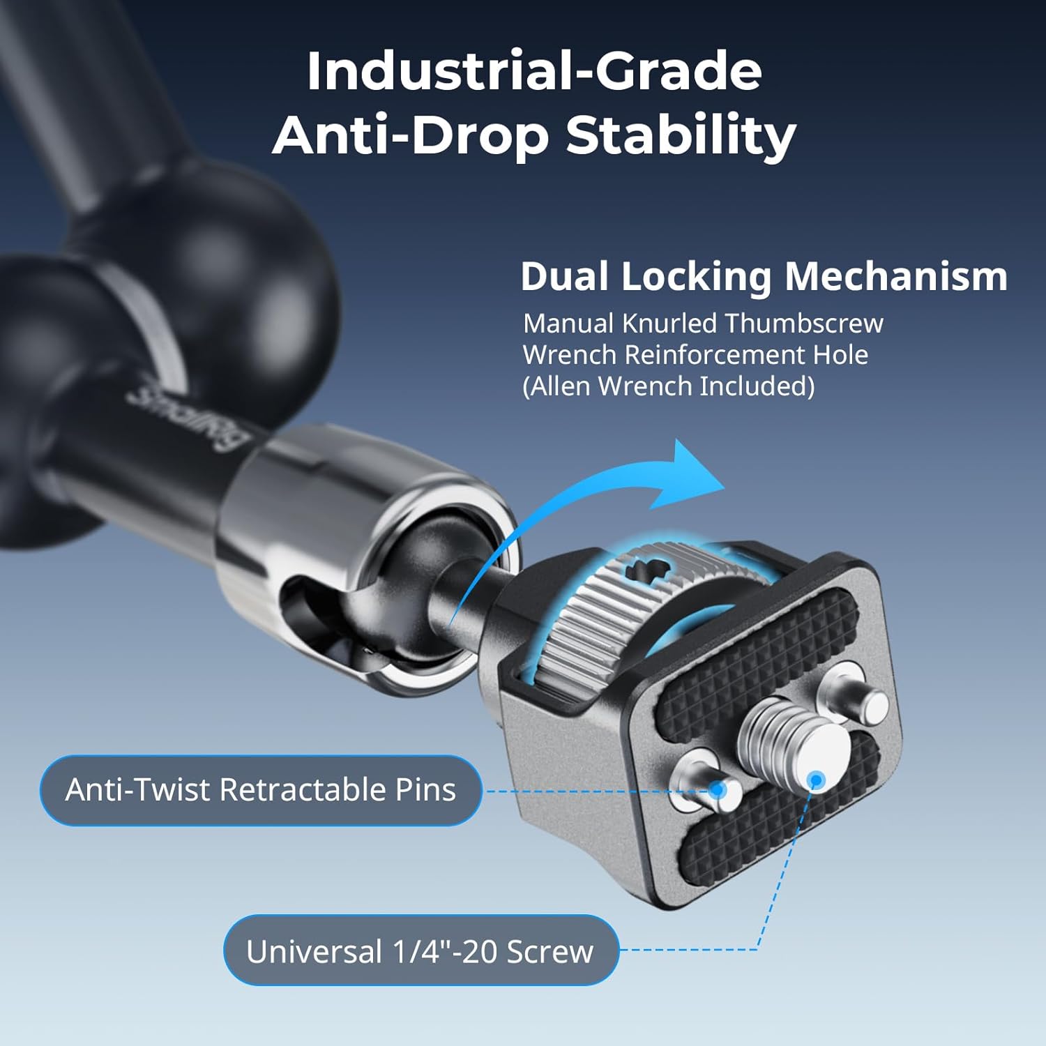 - Tool-Free Quick Lock & Anti-Twist Design: SmallRig Magic Arm with Crab-Shaped Clamp (7") 5310 consists of a magic arm and a crab-shaped clamp. One end features a 1/4"-20 screw and retractable pins, equipped with a knurled thumbscrew for easy tool-free fastening, along with an additional securing hole for tightening using the included Allen wrench.
