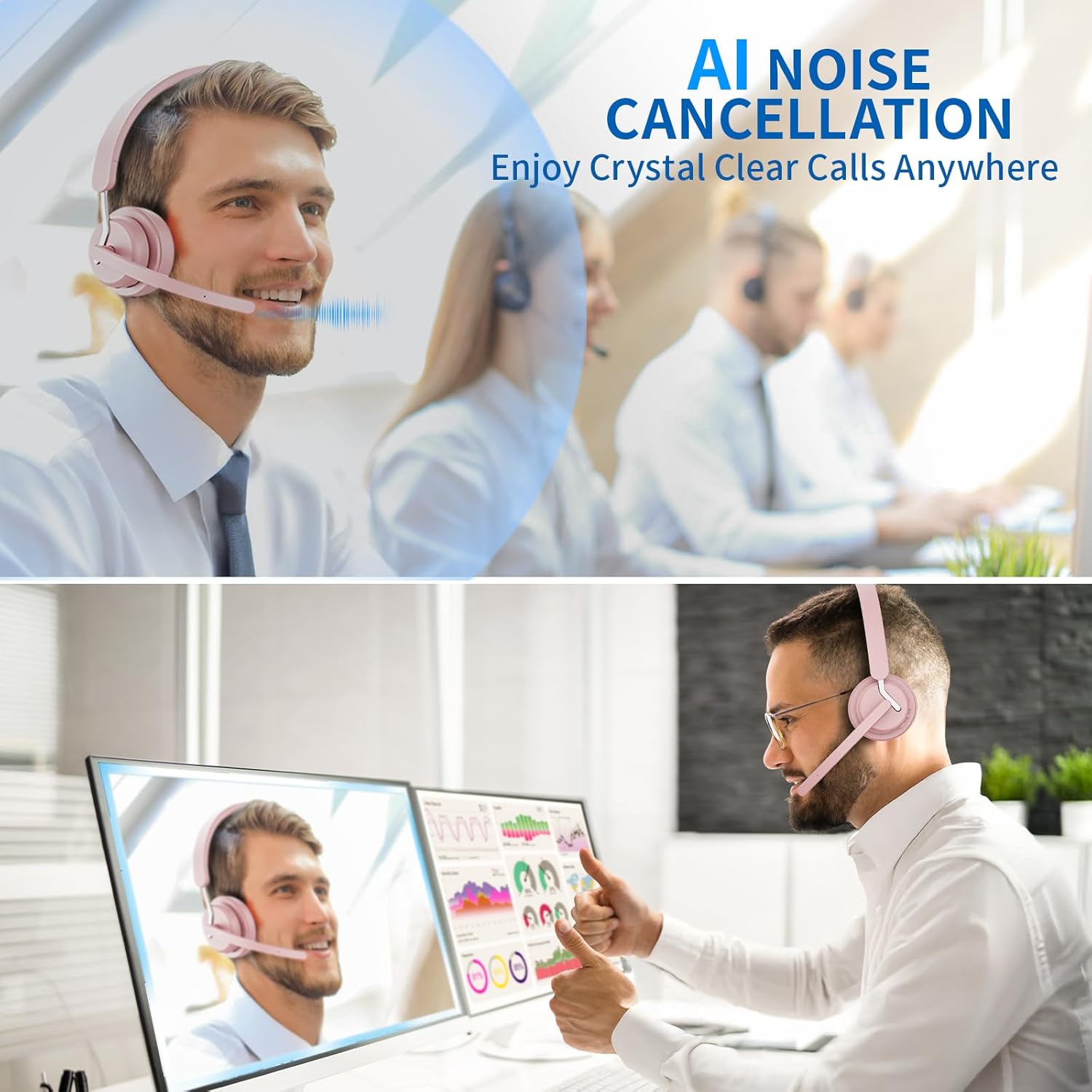 Wireless Headset with Mic, 2.4GHz Bluetooth Headset with AI Noise Cancelling Microphone & Charging Base, Wireless Headphones with USB Dongle for PC (Pink, L)