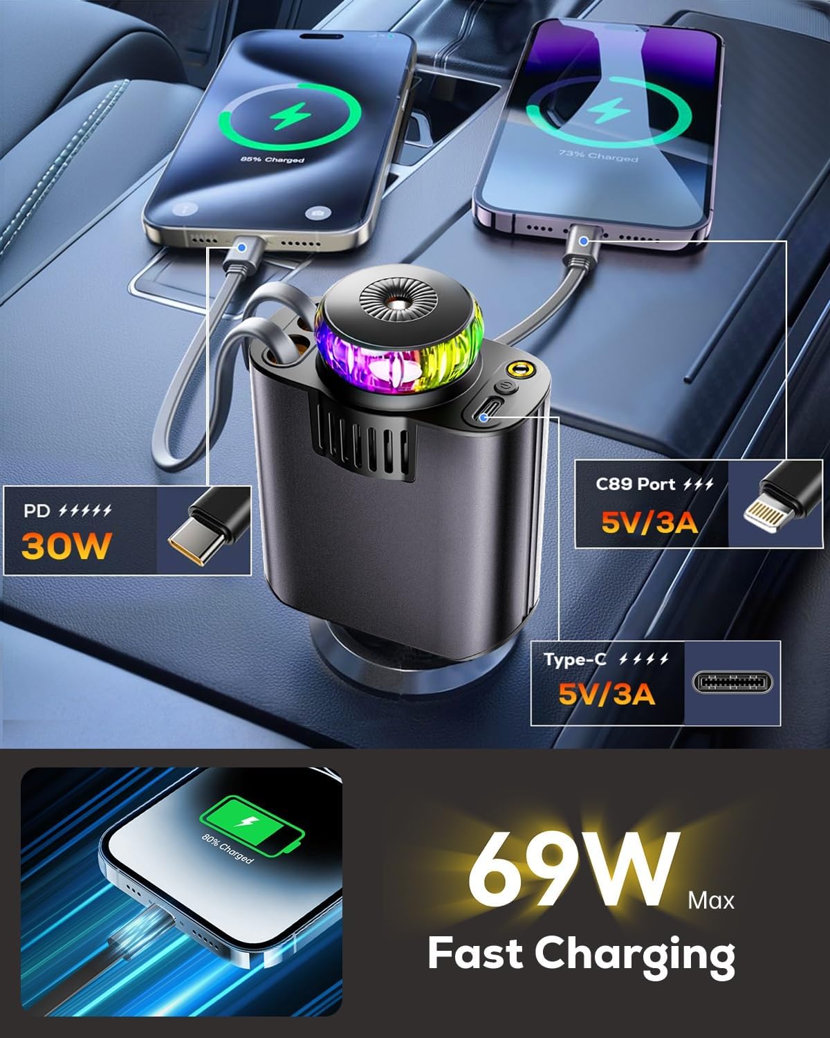 - 69W 5-in-1 Retractable Car Charger: This multifunctional car charger is designed to integrate fast charging, car aromatherapy, and starlight functions. The retractable cable can be extended to 31.5 inches, providing a neat and orderly solution for charging multiple devices. The 180° adjustable plug is flexible for 12V car cigarette lighters, Ideal for small spaces such as compact cars and truck cabs or daily use. Keeping your car neat and organized at all times is a must-have, reliable car accessory for RV and truck drivers on long trips!