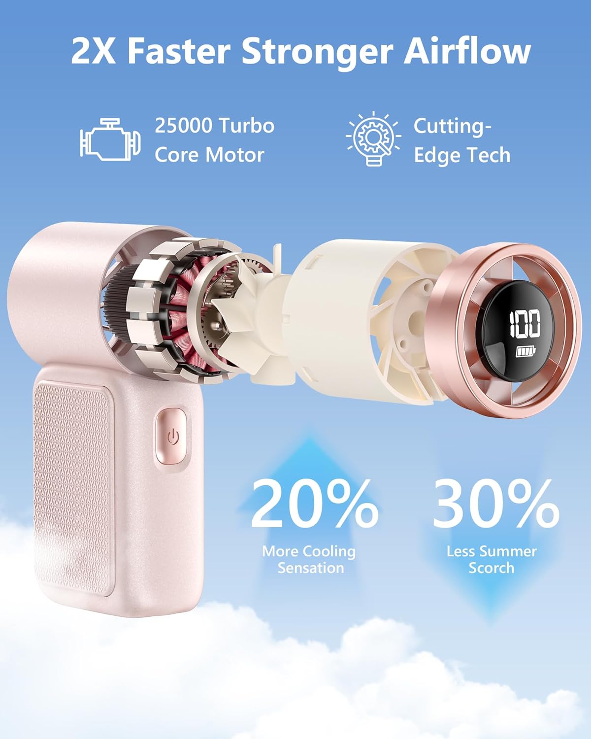 - 【Powerful Airflow, 2X Faster】Featuring a 25000 RPM motor, this fan delivers 2x stronger airflow than standard handheld fans. Feel the difference withhigh-speed gusts (up to 9m/s) that cool you down quickly—ideal for sweltering summer days, workouts, or crowded spaces.