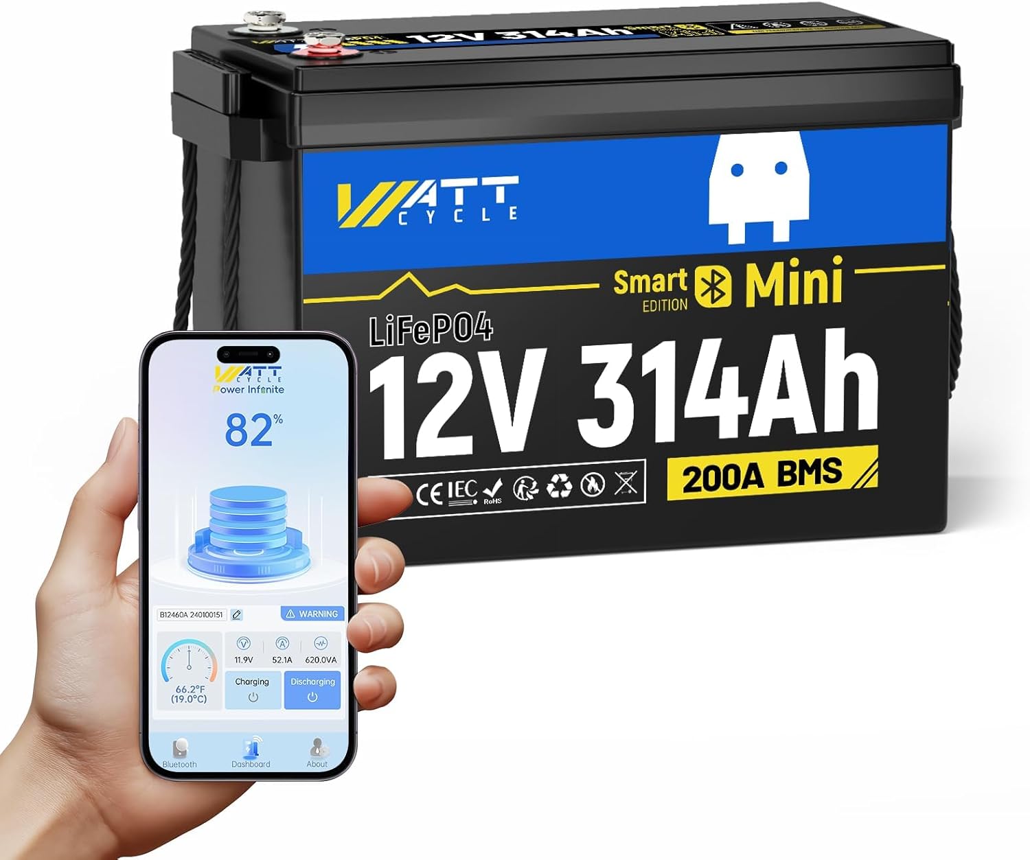 - Hassle-Free High Capacity: This WattCycle 12V 314Ah Mini LiFePO4 Lithium battery offers an impressive 4.01 kWh of energy, surpassing three 12V100Ah/ 12V 300Ah lithium batteries connected in parallel. Perfect for RVs, solar systems, home storage, trolling motors, and marine use. Supports up to 4S4P configurations for a maximum capacity of 64.307 kWh.