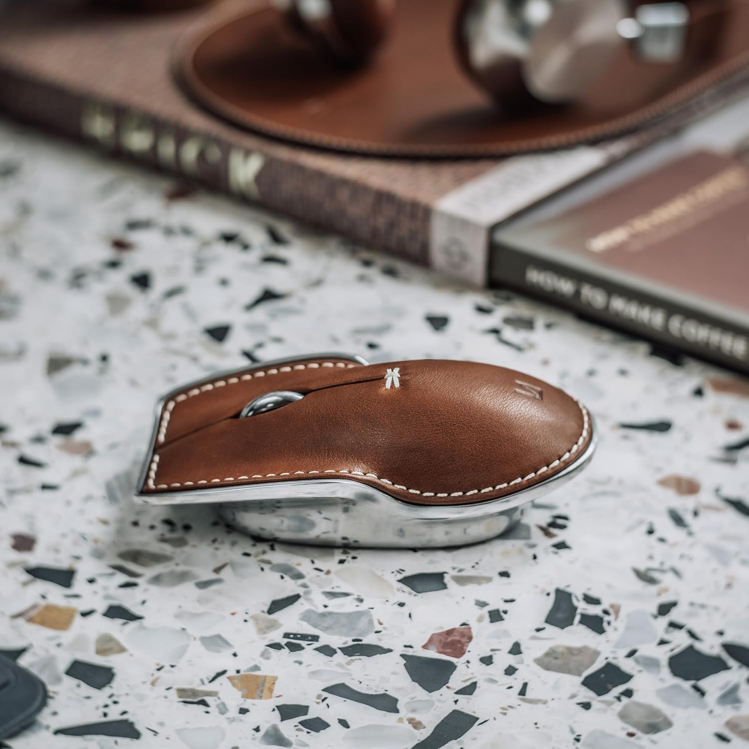 LUNAR ARTEFACTS Ambidextrous Rechargeable Bluetooth Wireless Computer Mouse Brown French Leather and Aluminum, Qi Enabled USB-C