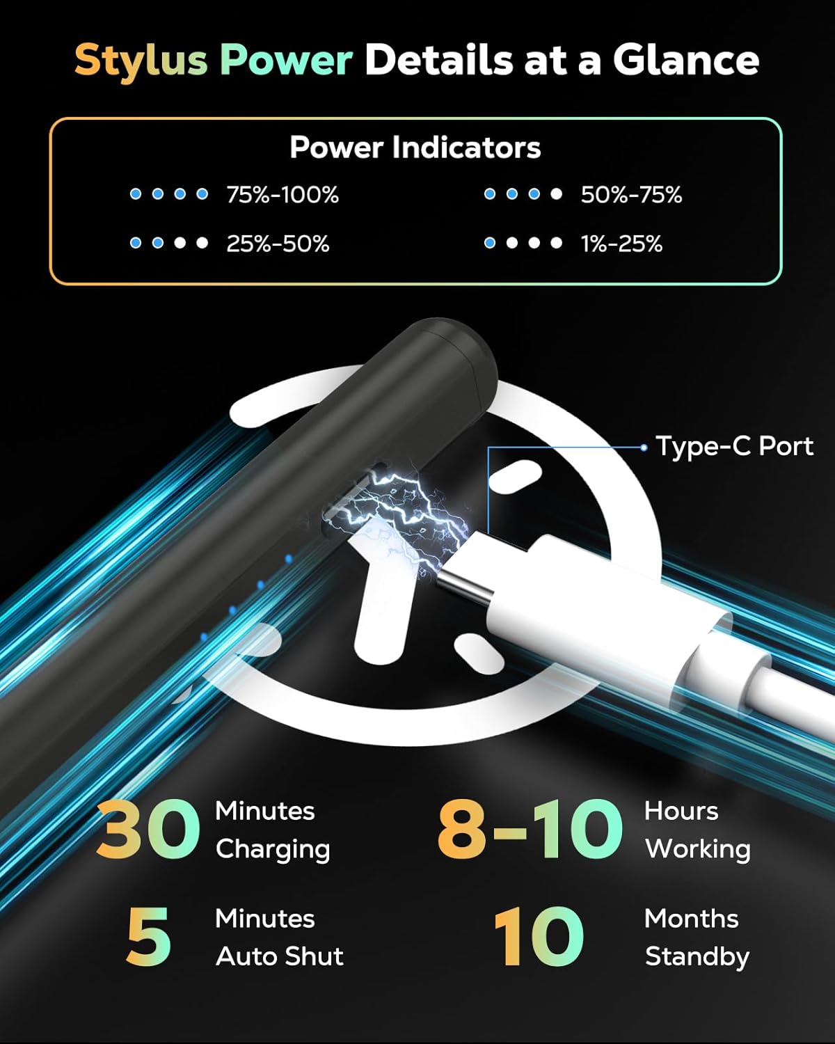 - Fast Charging Technology: Double-tap the cap to turn on your iPad A16 Pencil. It is charged by Type-C cable (included) and can be fully charged in about 30 minutes. When fully charged, the stylus pen for iPad can continue to work for 8-10 hours and standby for 10 months. It shuts off automatically after 5 minutes of inactivity to save power