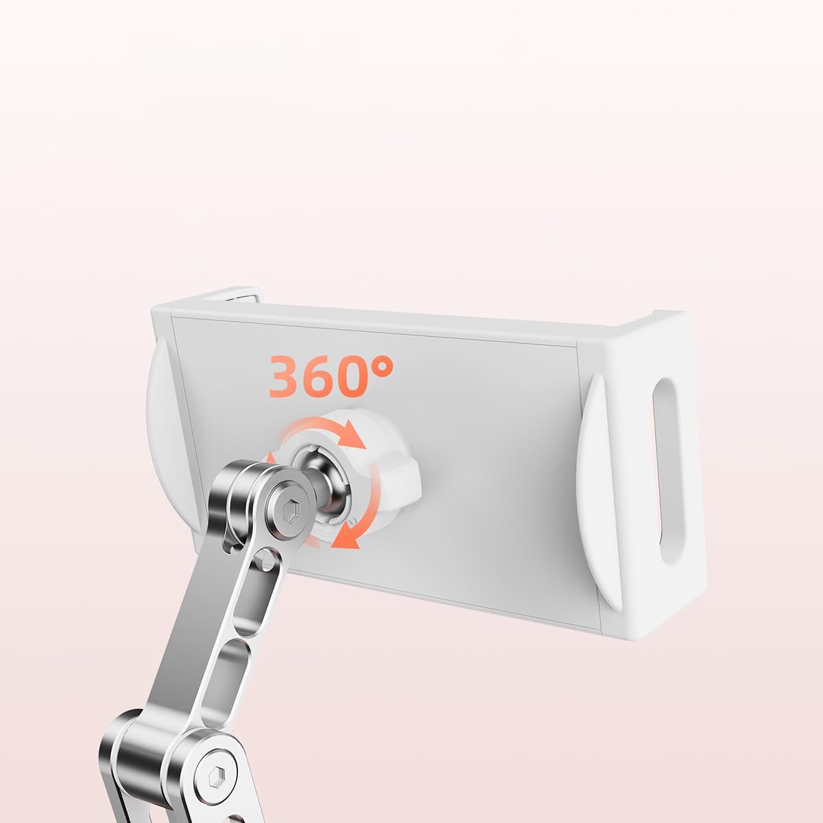 - Foldable Arm&Angle Adjustment:This tablet stand equipped with a 360° rotating clip and 180° foldable single-arm, ensures ergonomic viewing while freeing your hands. The adjustable arm can be folded down into the storage bowl, making it highly compact and easy to store or carry. Perfect for travel or clearing space when not in use—no tools required.With toolkit accessories, if the joints are too loose and tight, you can adjust to the appropriate node at any time.