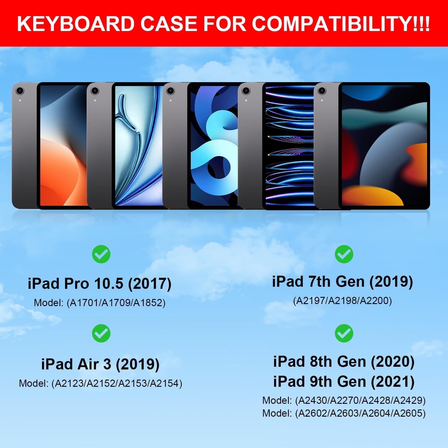 - Case with Keyboard for iPad 10.2 /Pro 10.5 Compatibility:Compatible with iPad 9th Gen (2021, 10.2 inch) Models A2602 A2603 A2604 A2605; iPad 8th Gen (2020, 10.2 inch) Models A2270 A2428 A2429 A2430; iPad 7th Gen (2019, 10.2 inch) Models A2200 A2197 A2198; iPad Air 3rd Gen (2019, 10.5 inch) Models A2123 A2152 A2153 A2154; iPad Pro (2017, 10.5 inch) Models A1701 A1709 A1852. Please check your iPad model number on the back of your device (starting with "A") before purchasing to ensure compatibility.