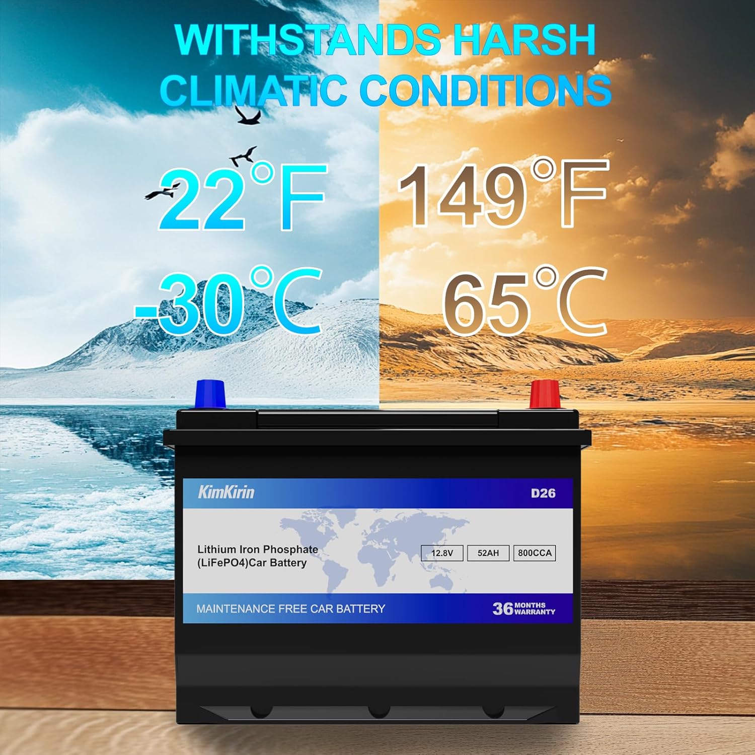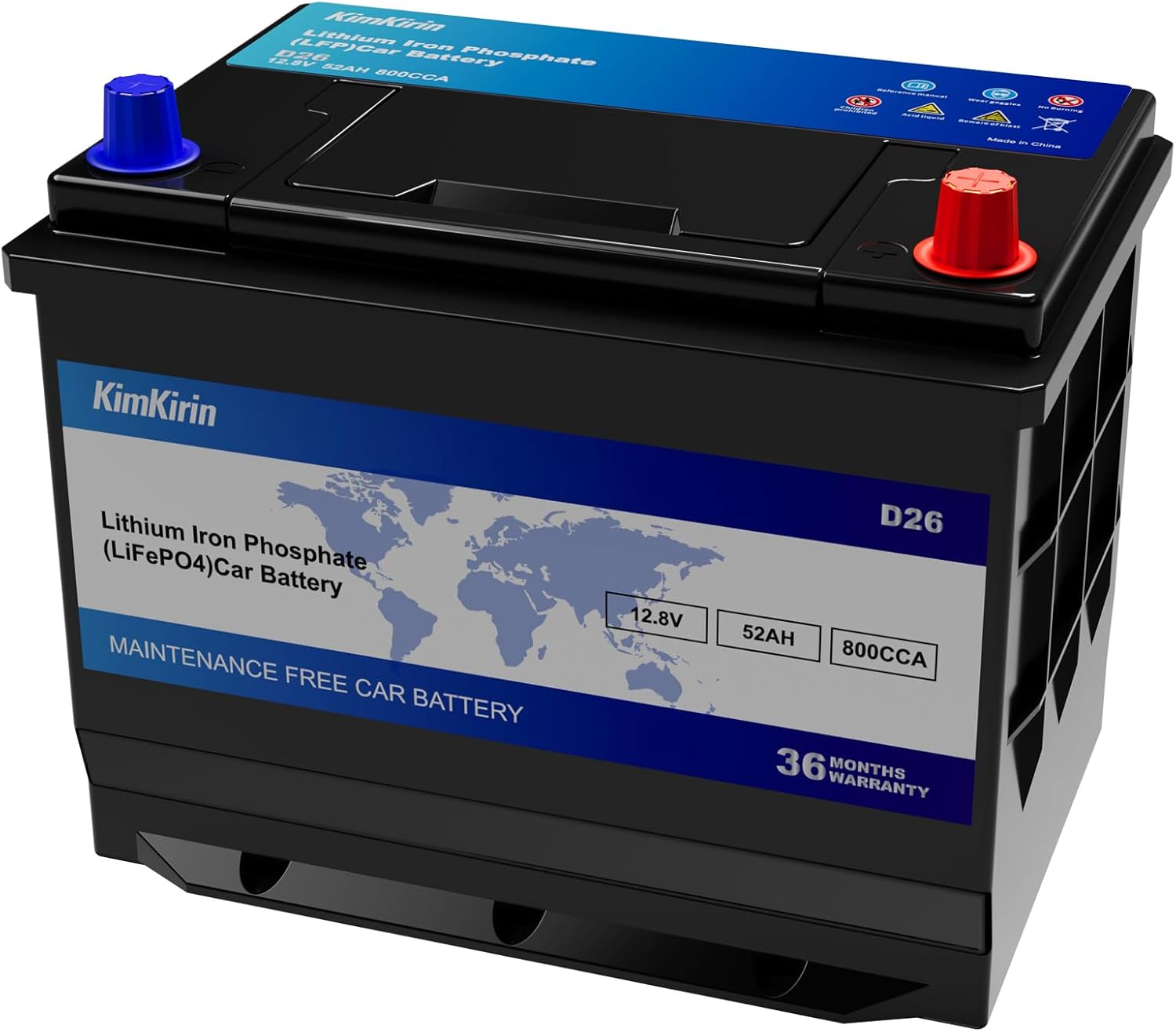 XINGCELL Kim Kirin12.8V 52Ah LiFePO4 Car Battery Group 24/D26 – Lithium Iron Phosphate Deep Cycle Battery with 800CCA High Cranking Power for Start-Stop Cars RV Marine Solar