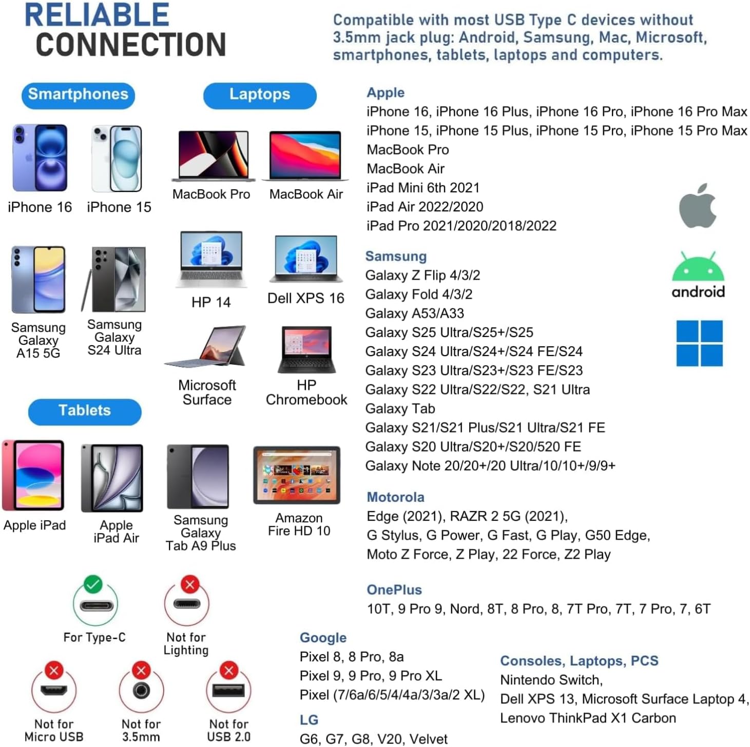- SAMSUNG: Galaxy S24/S23/S22/S21/S21+/S21 Ultra/S21/S21 Ultra/S21 FE/S20/ Galaxy Tab S8/S7/S6/S5e, A53/A54/A33/A34 - GOOGLE Pixel 7/6a/6 PRO/6/5/4/4a — MOTOROLA Edge 2021 — LAPTOPS: DELL XPS 13, MICROSOFT Surface Laptop 4. And more devices without a 3.5mm jack port. We provide a 5-year warranty and our customer support is here to answer questions 24/7