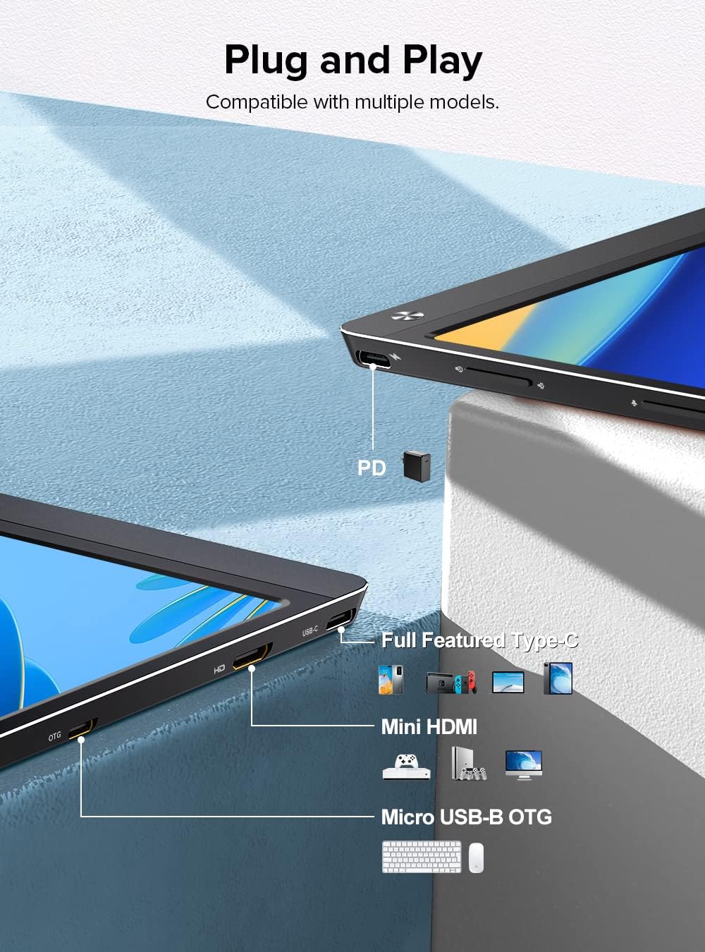 - 10-point Touchscreen Monitor: UPERFECT portable touchscreen monitor support 10-point capative multi-touch, compatible with all systems,no extra driver needed, just connect the USB C port on the battery monitor to your device to achieve the touch function (NOTE: All gaming device and mobile phone without full featured type C function can not get touch function)