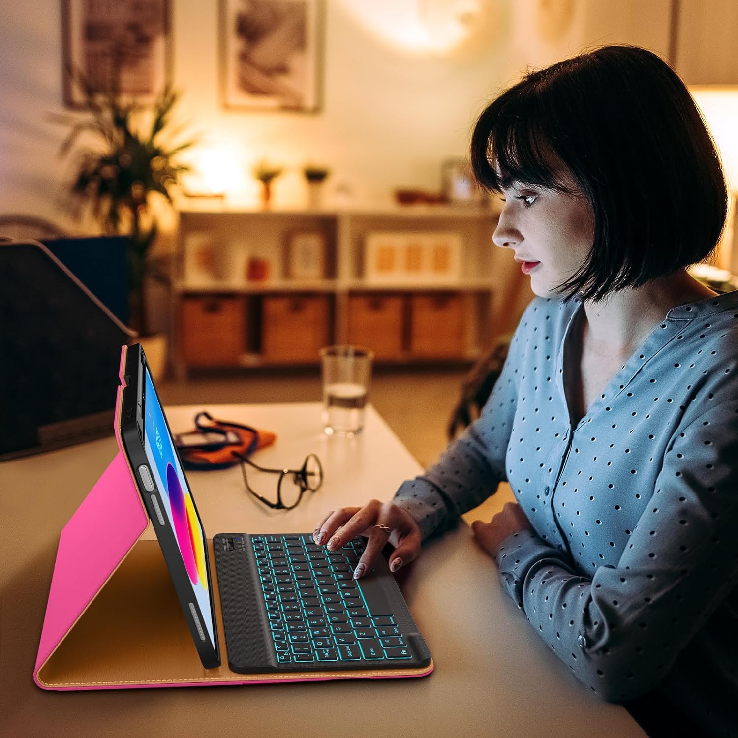 DTTO for iPad 11th (A16)/ 10th Generation Case with Keyboard (2025/2022), 7 Colors Backlit Wireless Detachable Keyboard Leather Folio Cover with Pencil Holder & Pocket, Rose Red